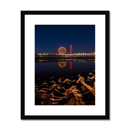 Blackpool Tower and Central Pier at night, with reflection of illuminations in water on the beach UK. Framed & Mounted Print