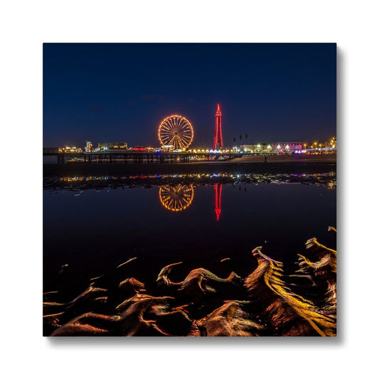 Blackpool Tower and Central Pier at night, with reflection of illuminations in water on the beach UK. Canvas