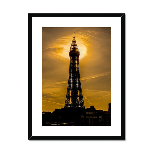 Blackpool Tower silhouetted against morning sunlight. UK. Framed & Mounted Print