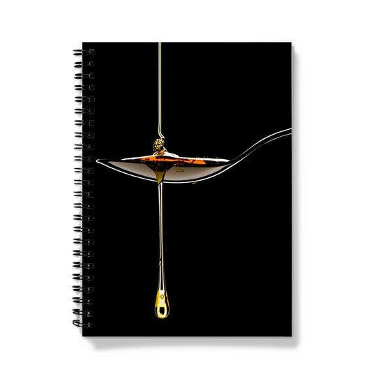 Honey pouring on to metal spoon and dripping off against black background. Notebook