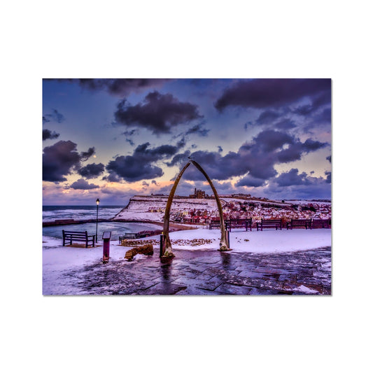 Whalebone Arch and view of Whitby Abbey in snow, Whitby, UK. Fine Art Print