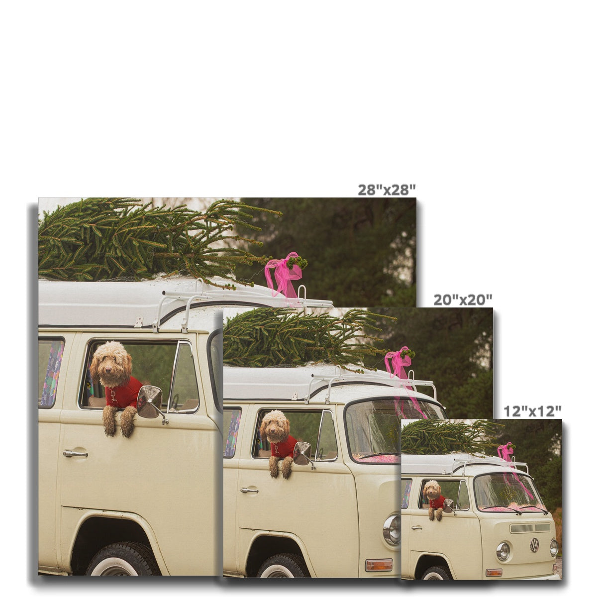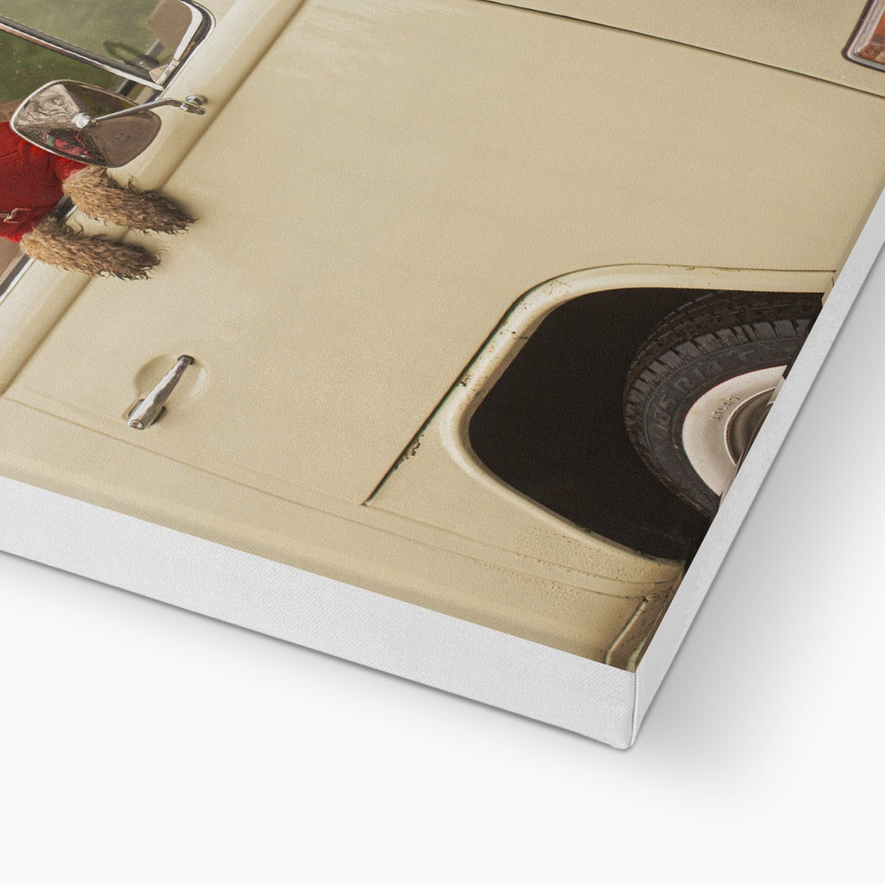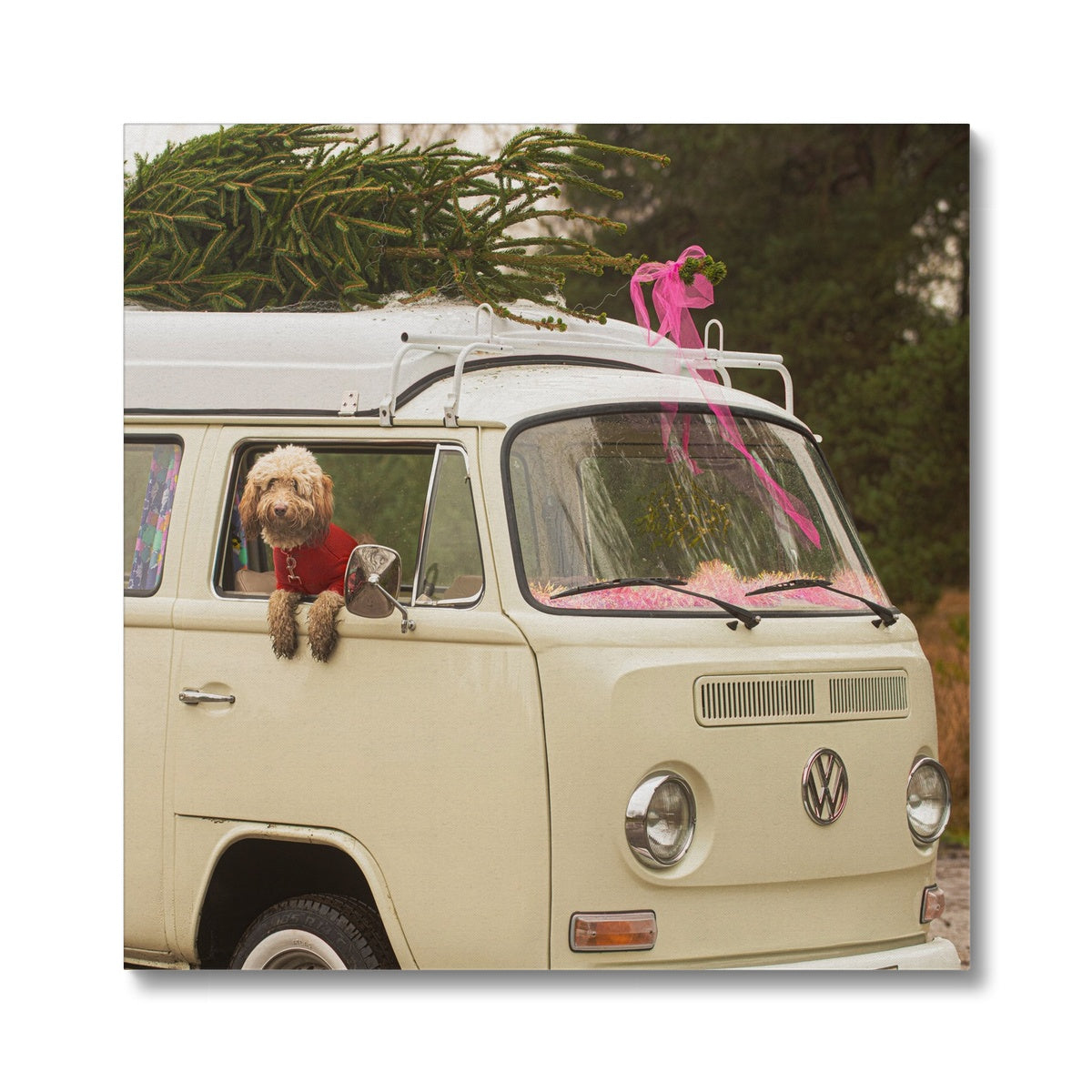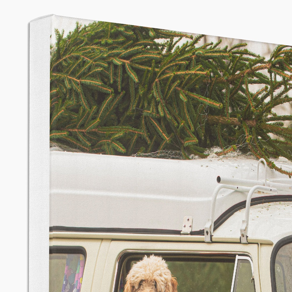 1972 VW Bay Window Campervan parked with with Christmas tree on roof and Cockapoo dog looking out of window. Canvas