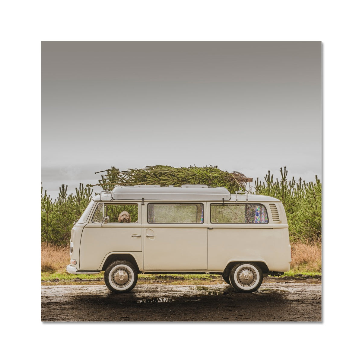 1972 VW Bay Window Campervan parked with with Christmas tree on roof and Cockapoo dog looking out of window. Fine Art Print