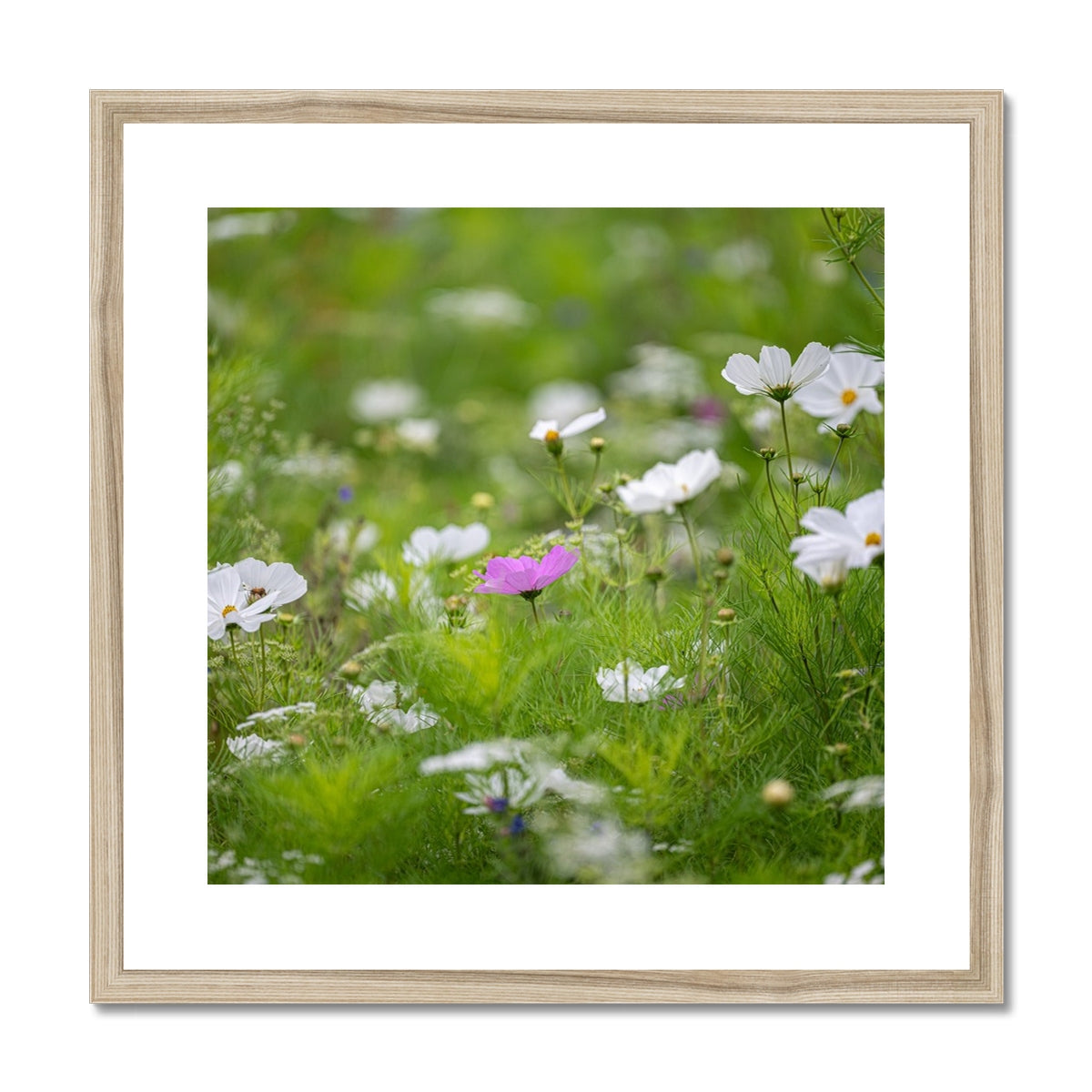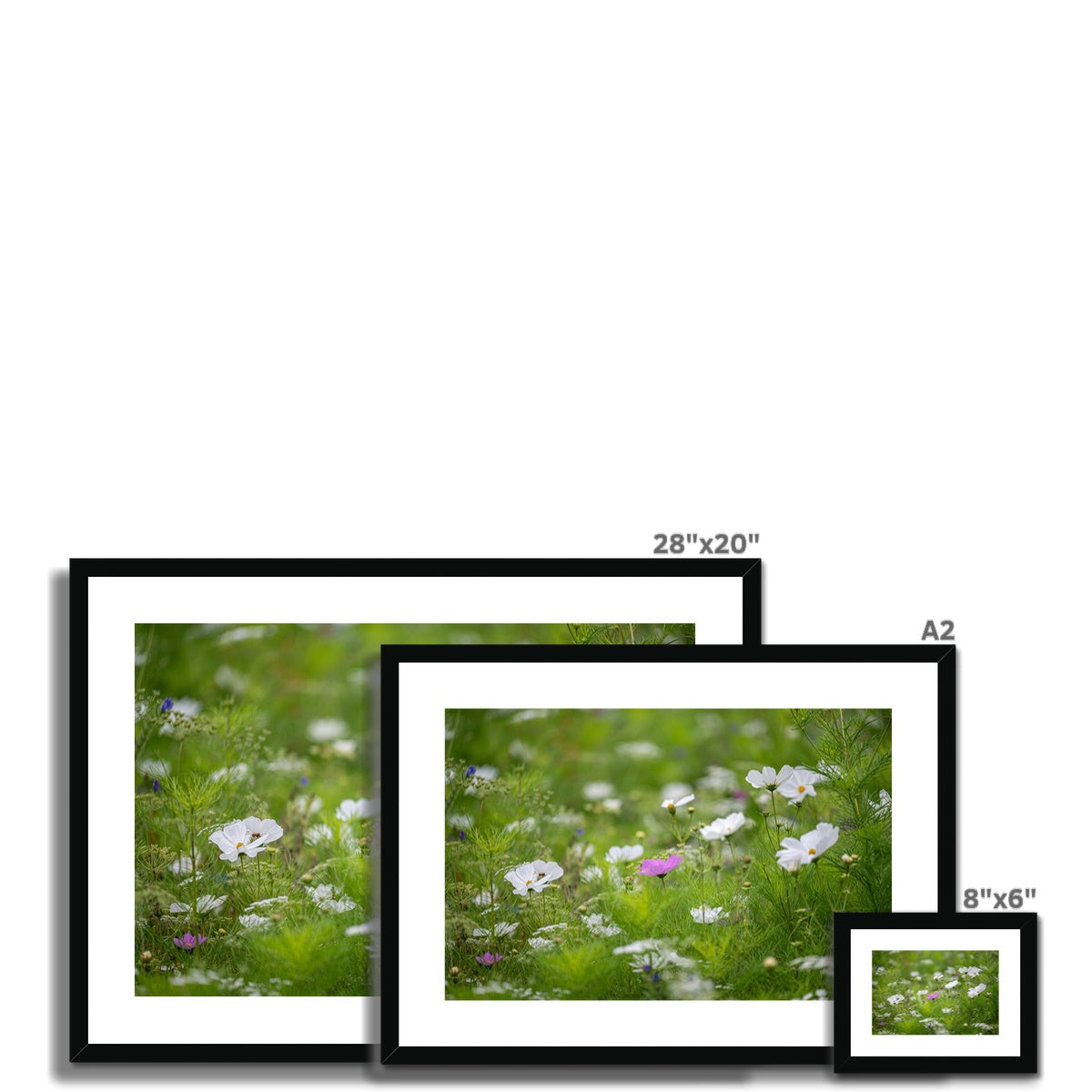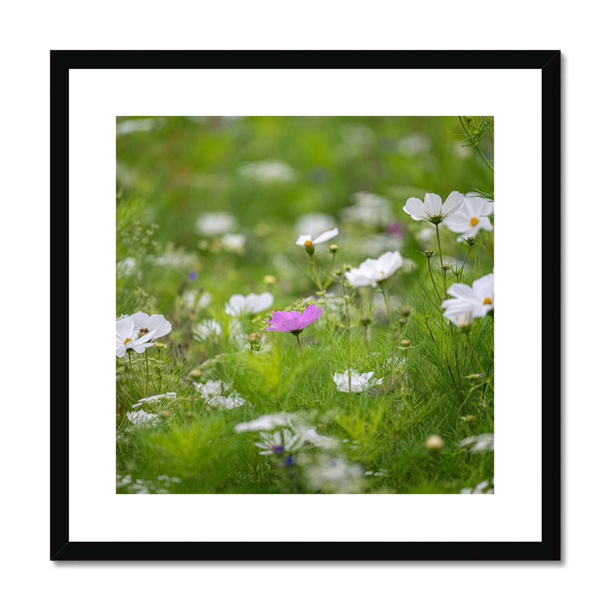 A single pink cosmos flower stands out in a summer meadow of delicate white blooms Framed & Mounted Print