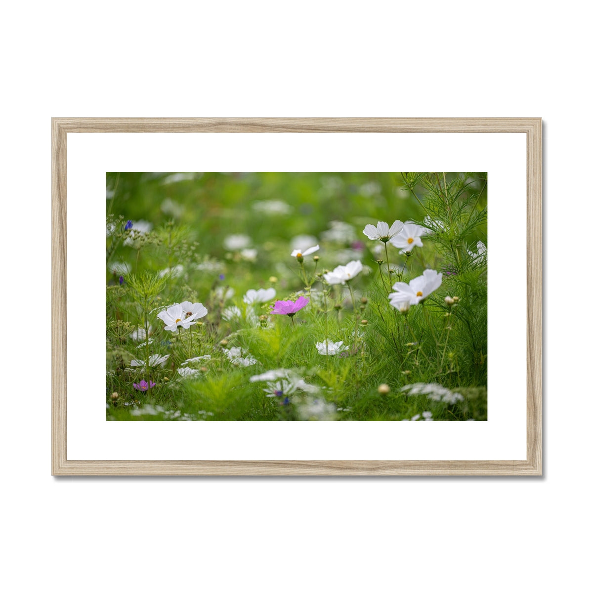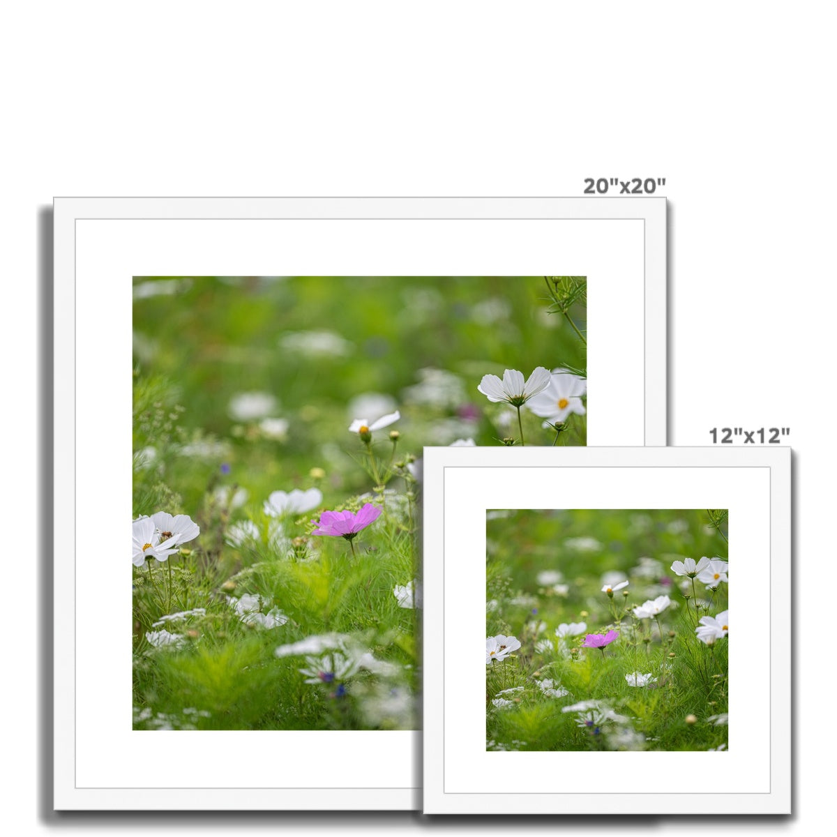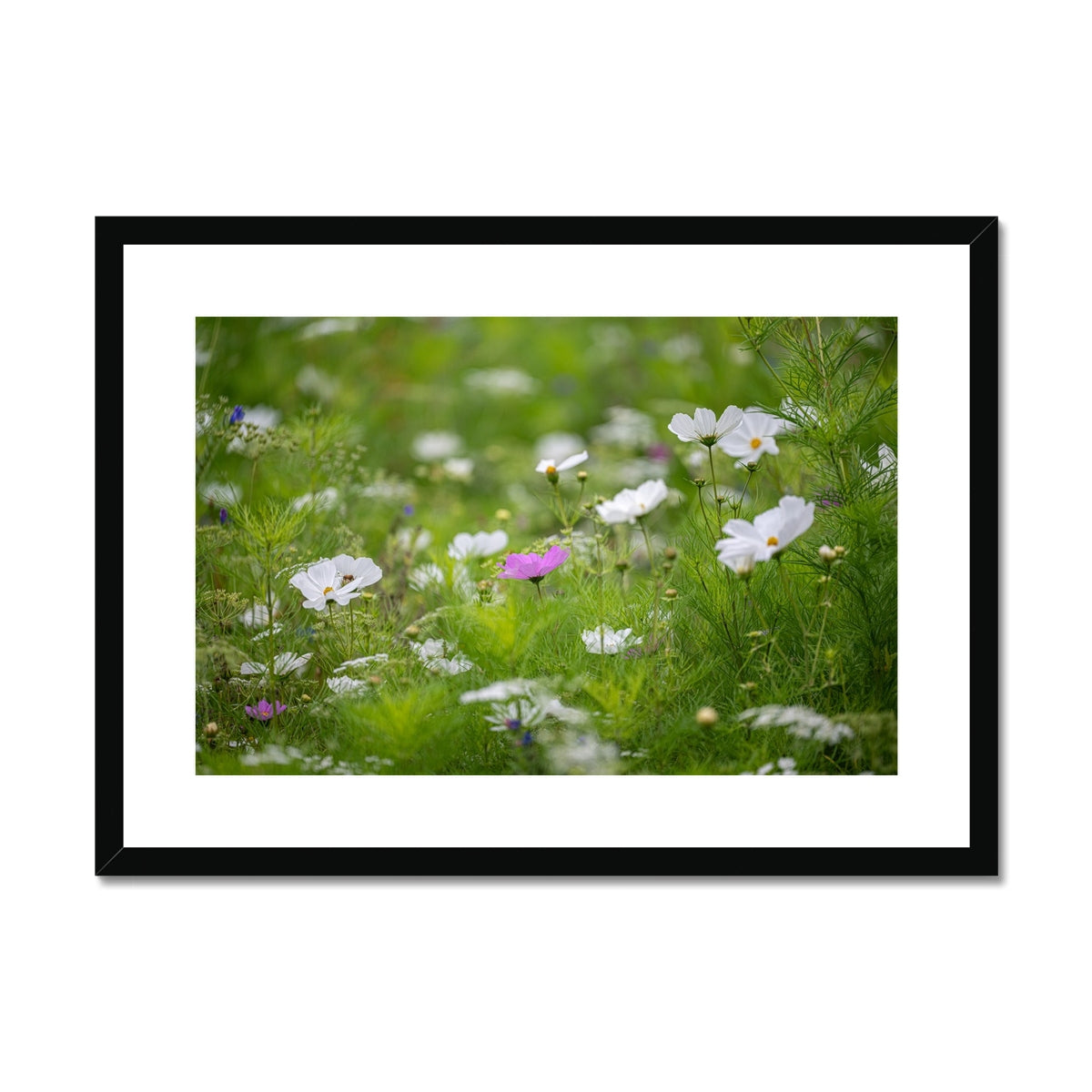 A single pink cosmos flower stands out in a summer meadow of delicate white blooms Framed & Mounted Print