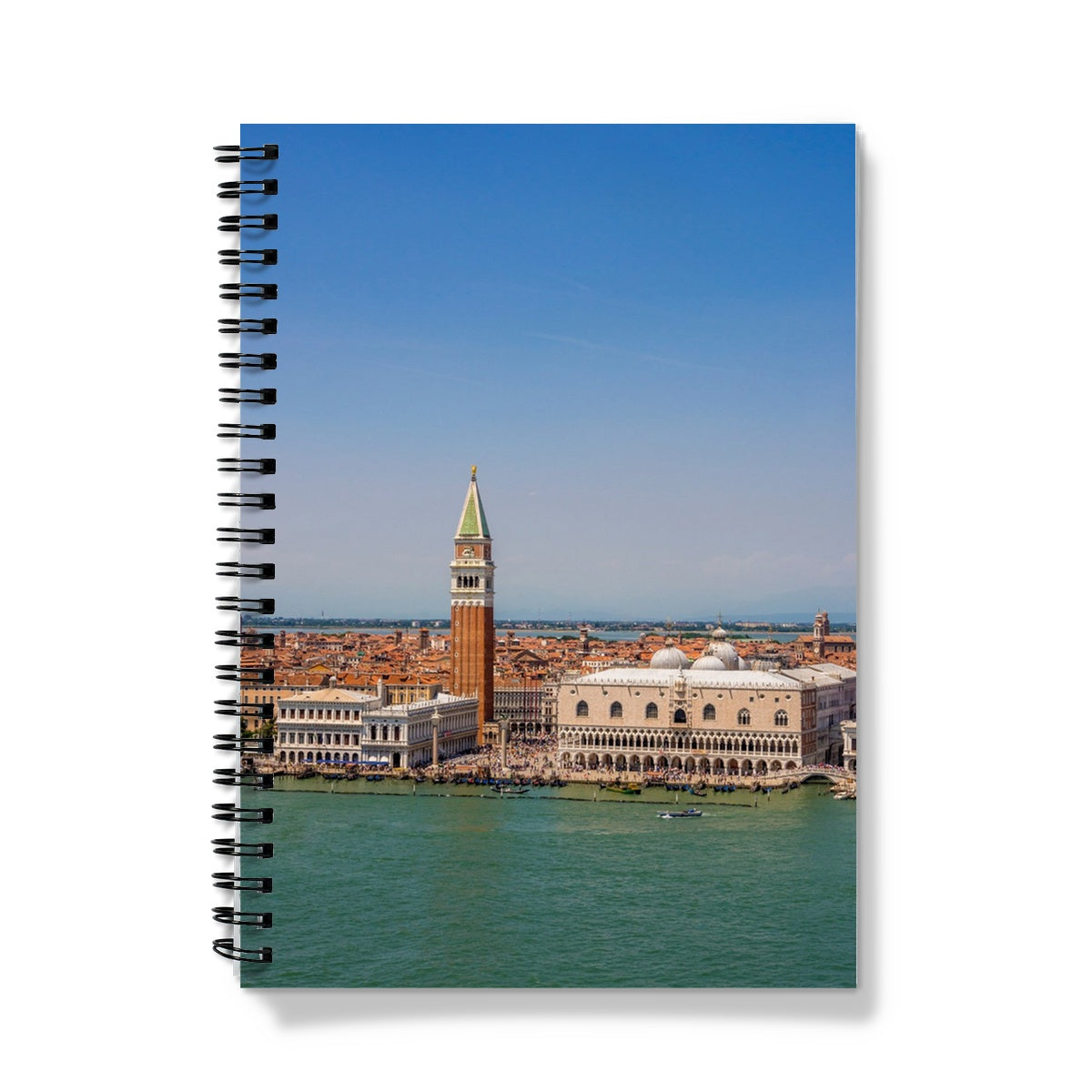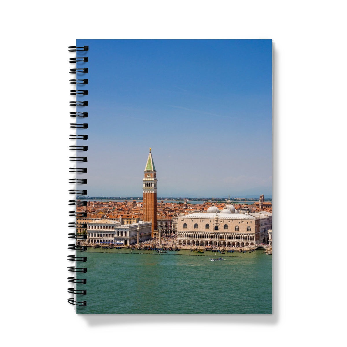 Aerial view of Doges Palace and the bell tower of St Marks basilica, St Marks Basin, Venice. Italy. Notebook