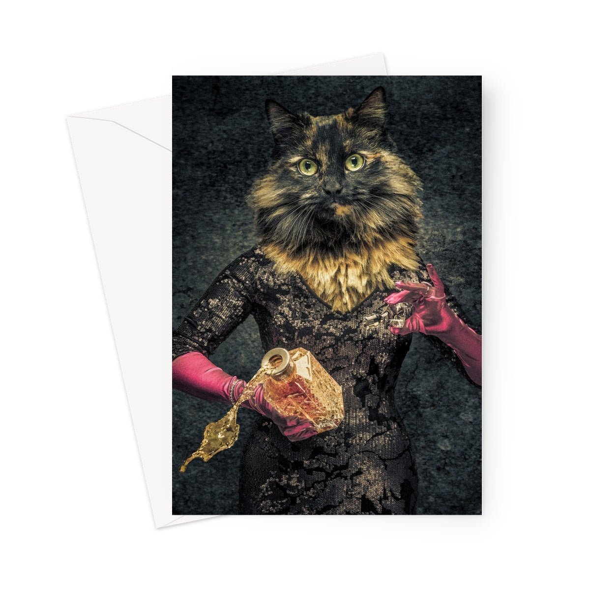 Anthropomorphic cat spilling drink from decanter Greeting Card