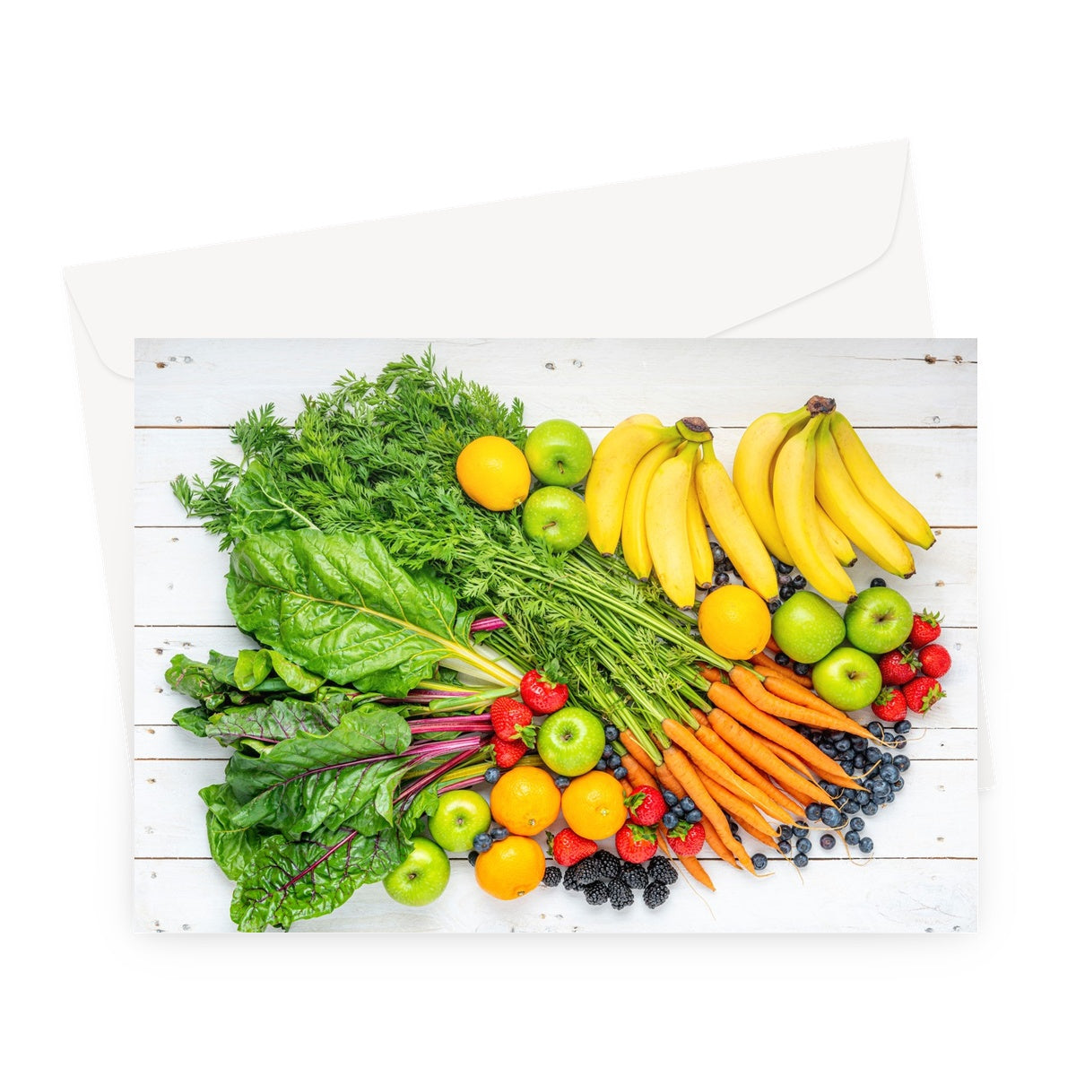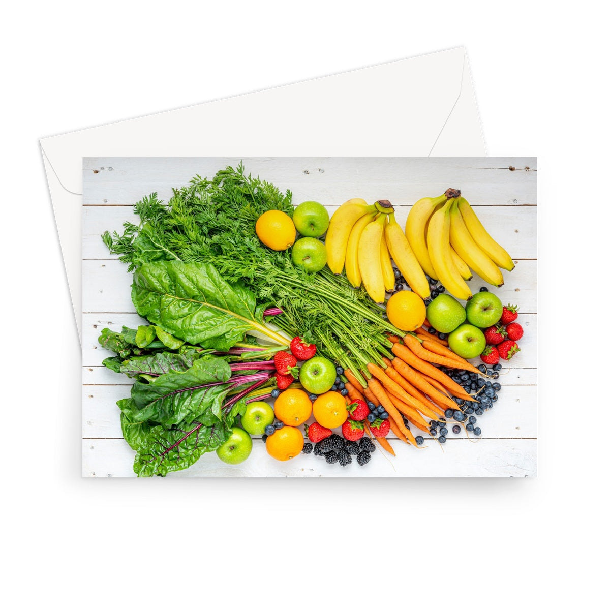 Assortment of fresh fruit and vegetables on white wooden boards. Greeting Card