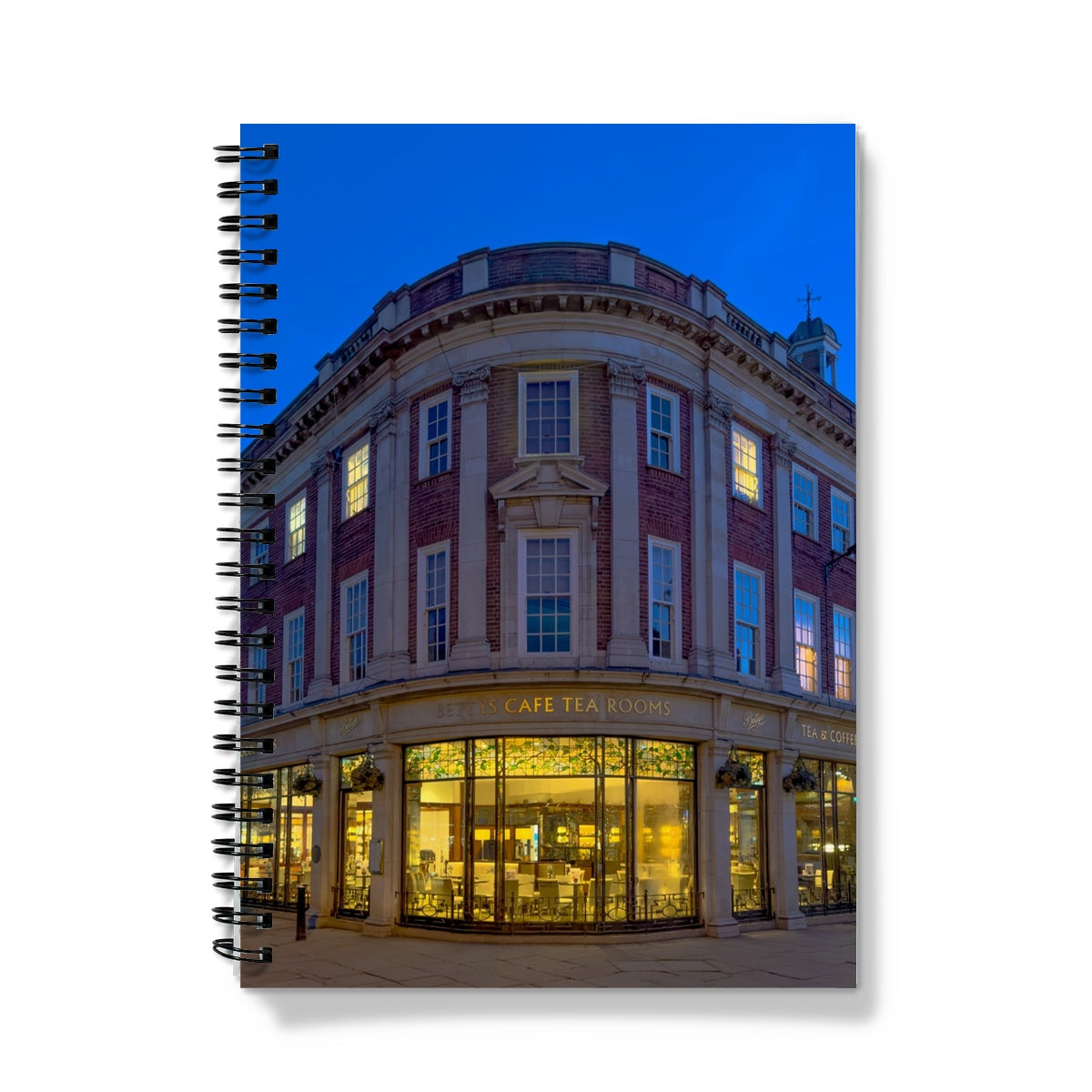 Bettys Café Tea Rooms at dusk, with its bullnose exterior facade. York UK Notebook