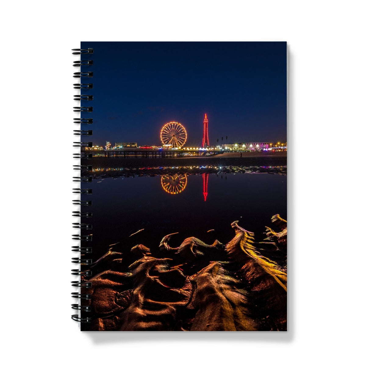 Blackpool Tower and Central Pier at night, with reflection of illuminations in water on the beach UK. Notebook