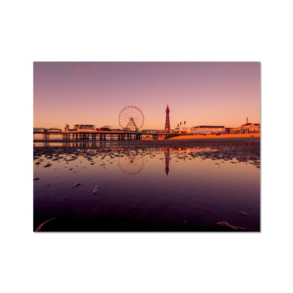 Blackpool Tower and Central Pier with beach reflections at sunset. Fine Art Print