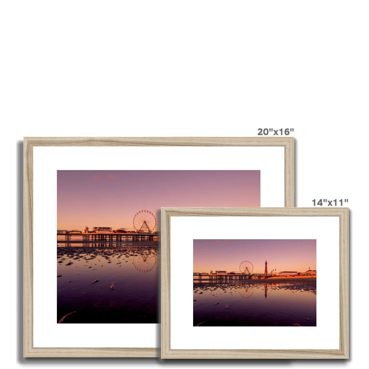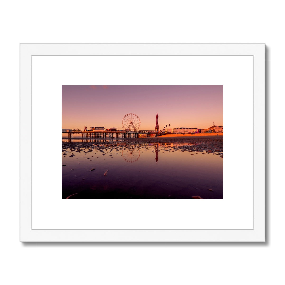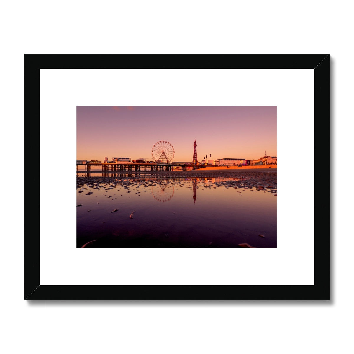 Blackpool Tower and Central Pier with beach reflections at sunset. Framed & Mounted Print