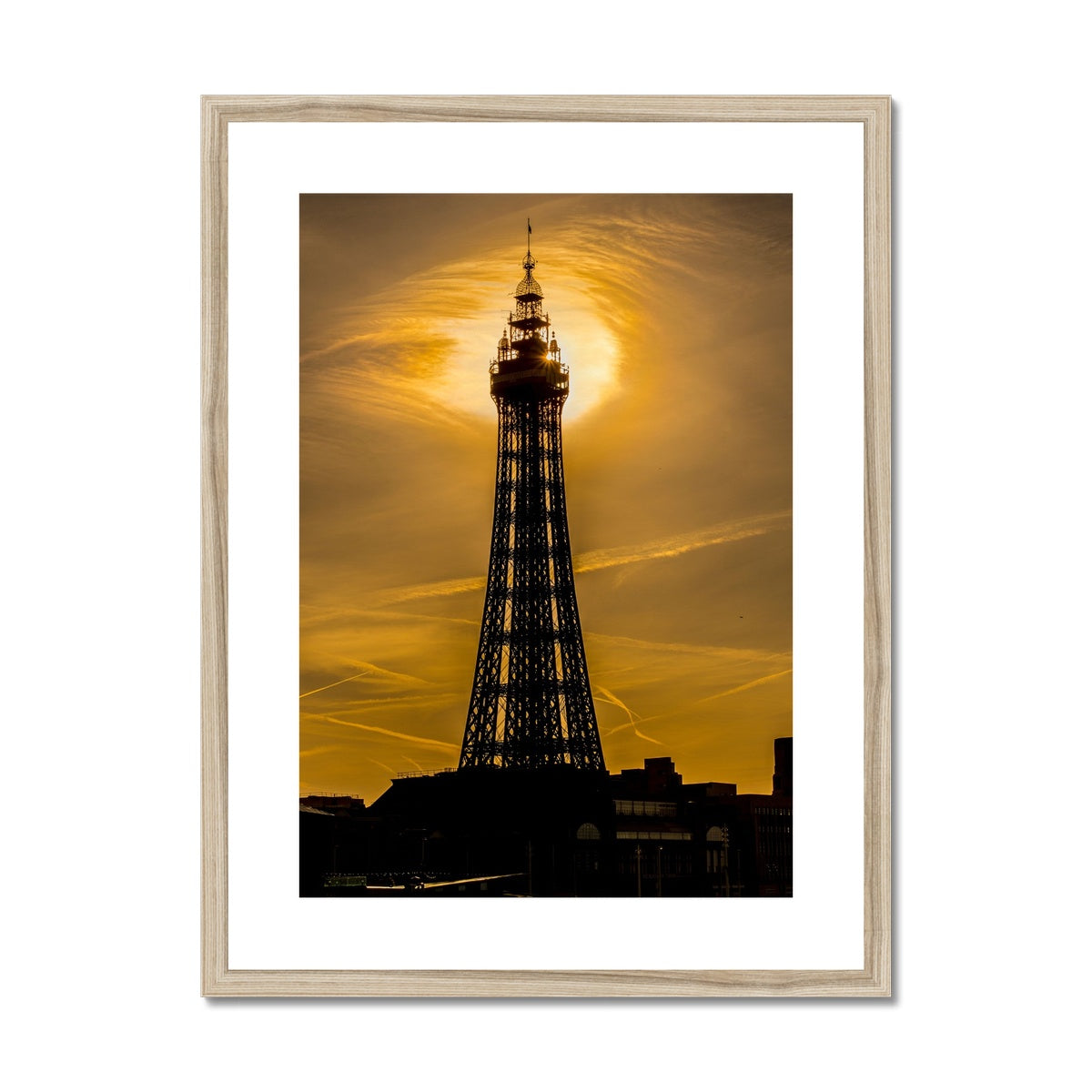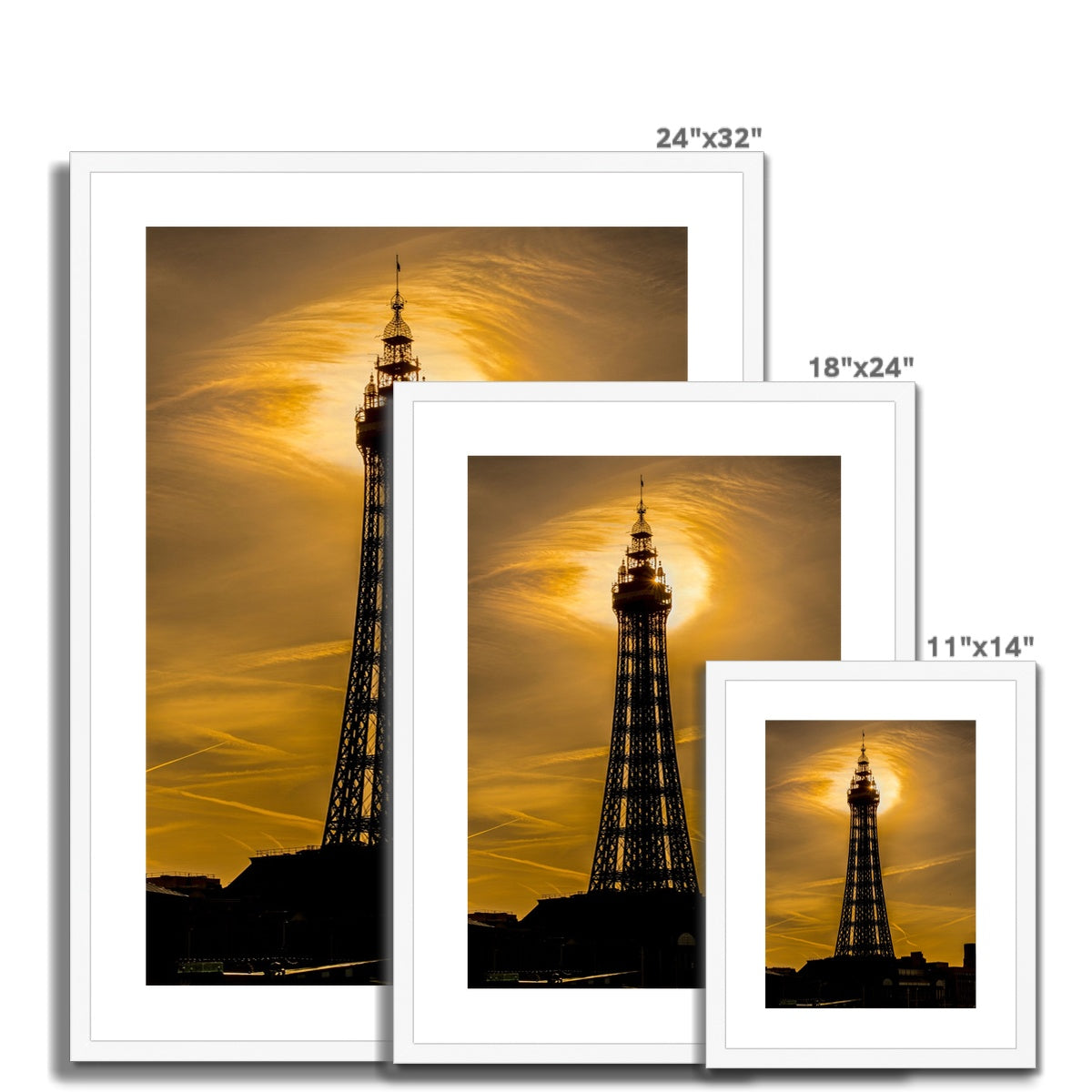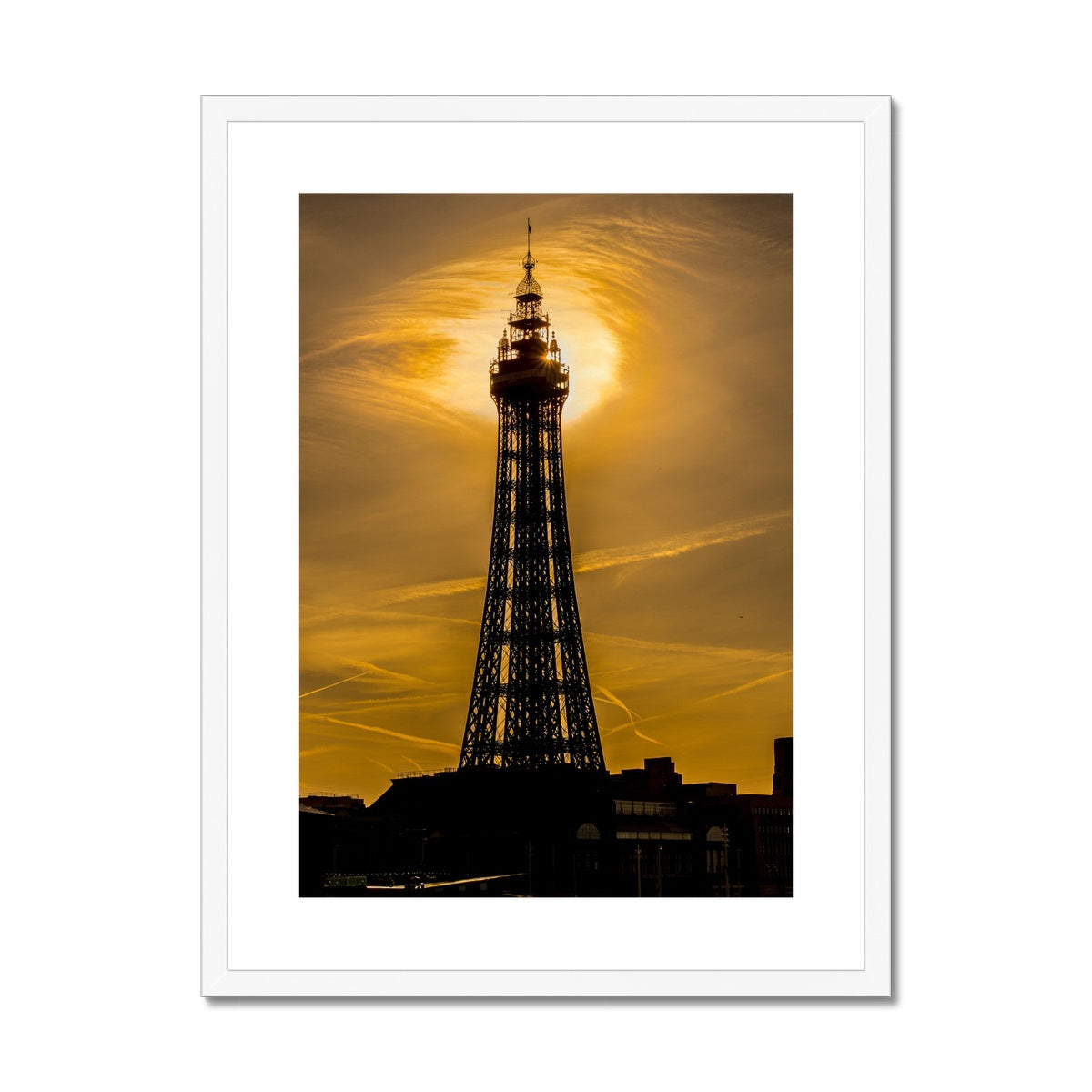 Blackpool Tower silhouetted against morning sunlight. UK. Framed & Mounted Print