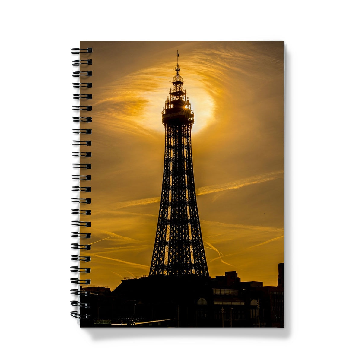 Blackpool Tower silhouetted against morning sunlight. UK. Notebook