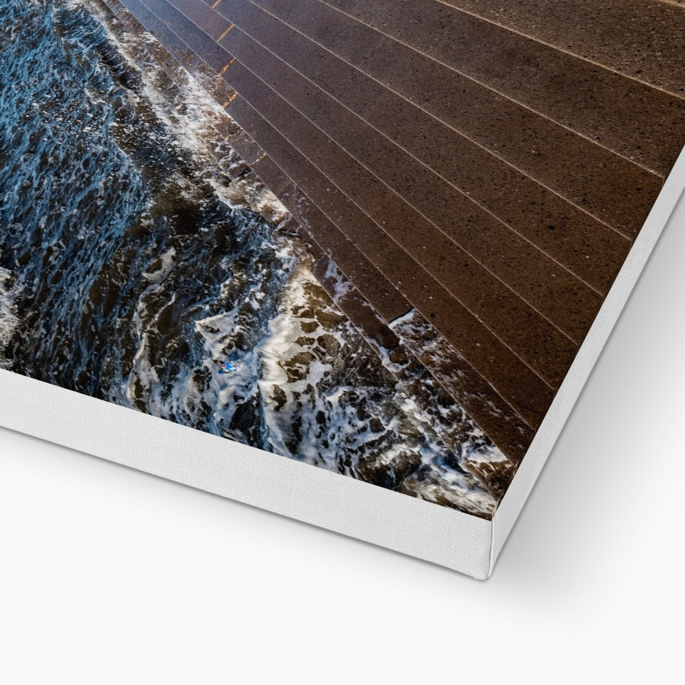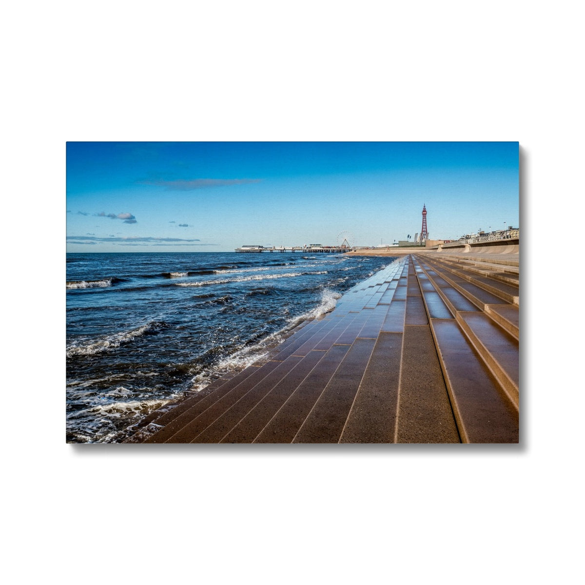 Blackpool's stone stepped sea defences with Blackpool Tower and Central Pier in the distance, Blackpool, UK. Canvas