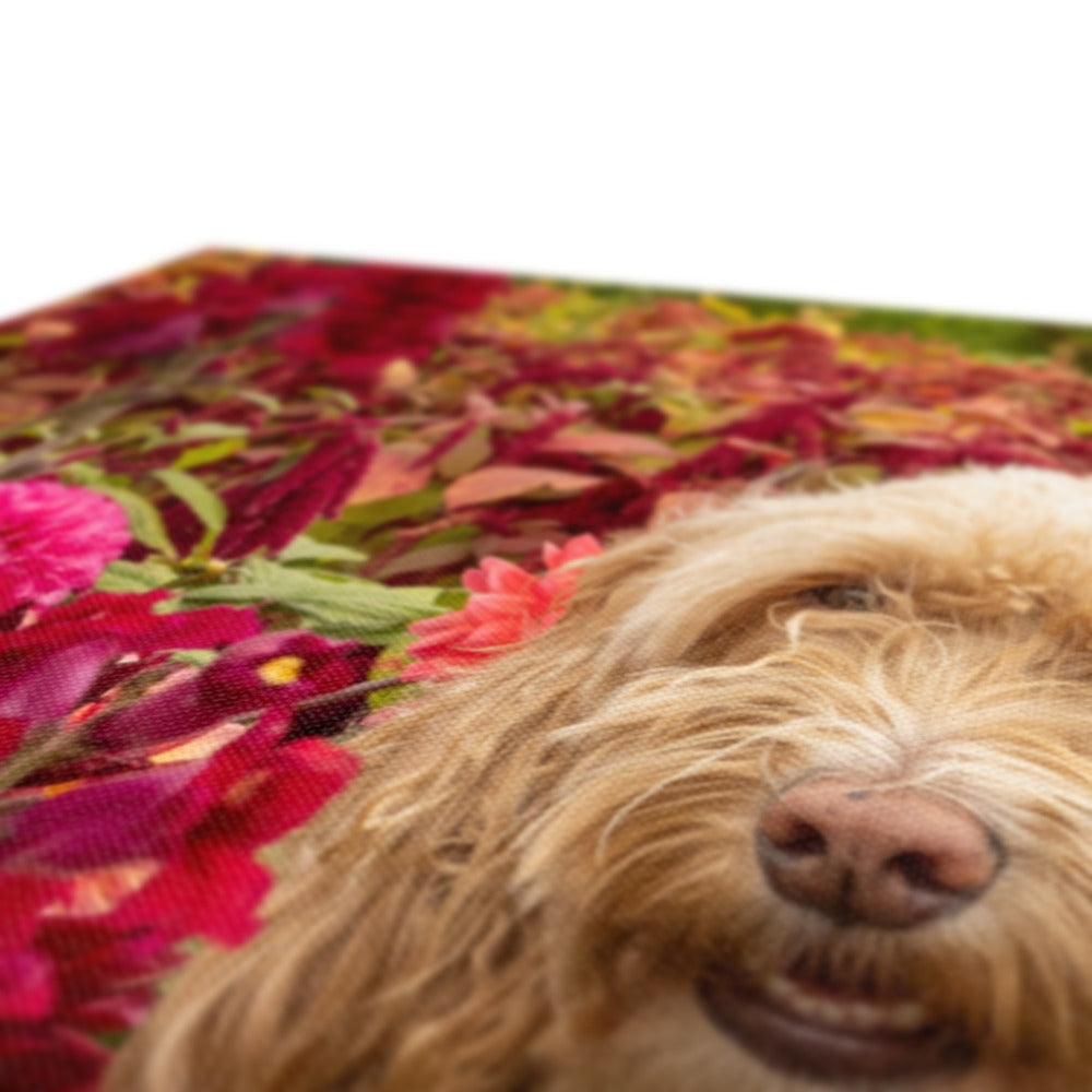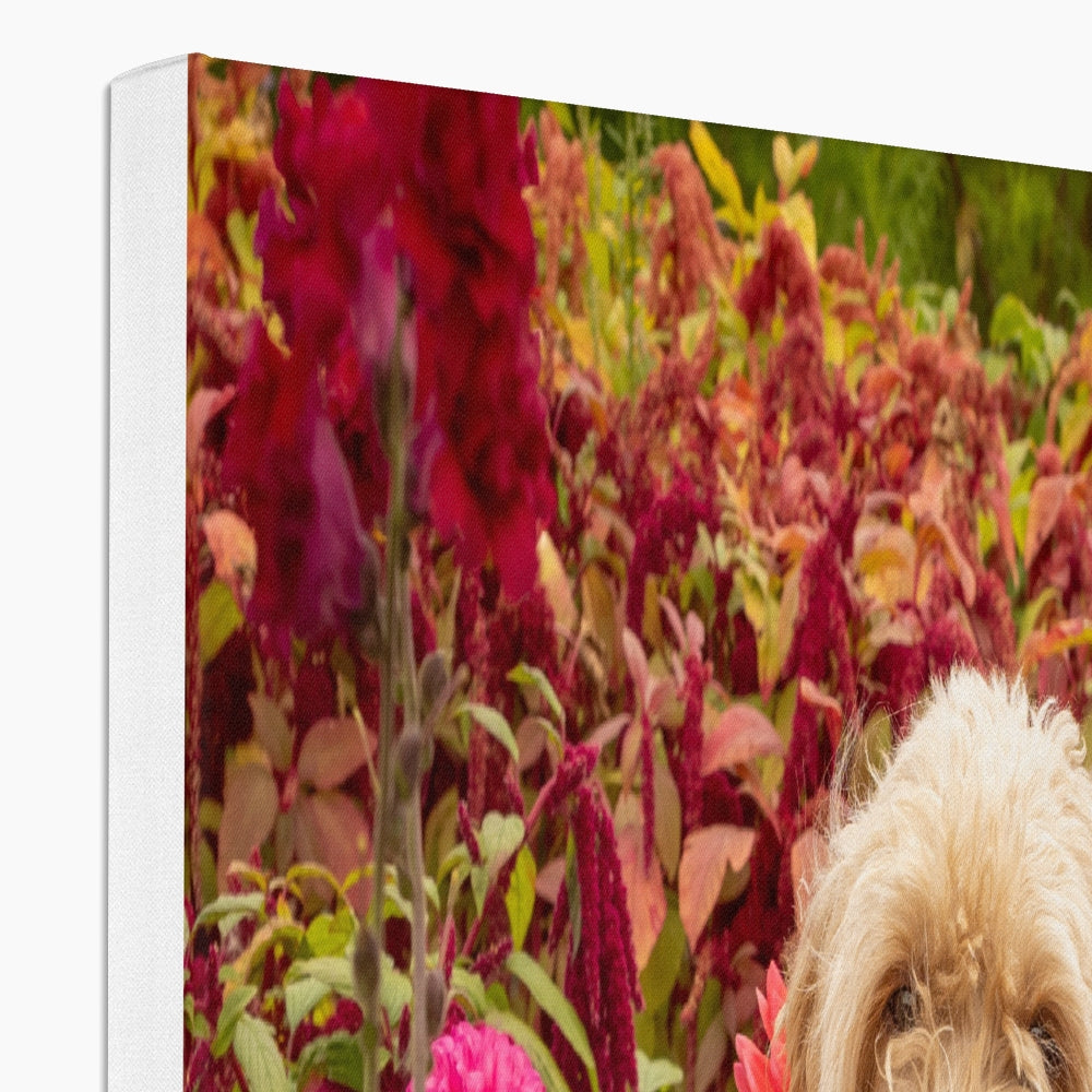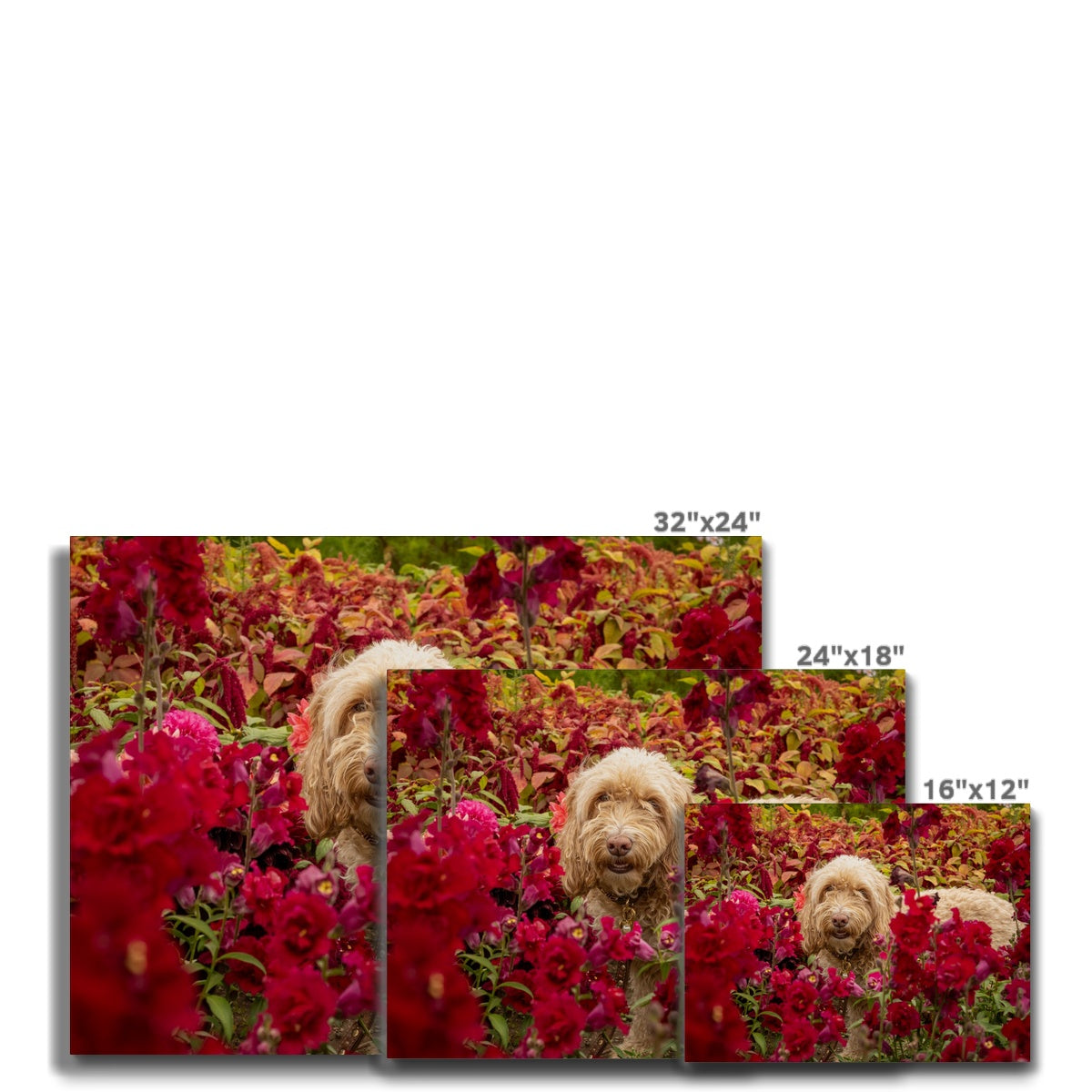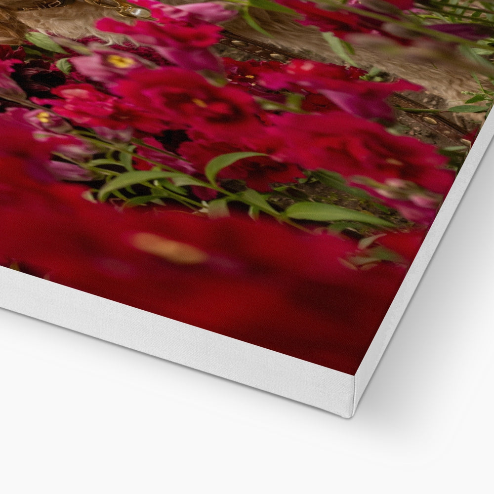 Blonde Cockapoo dog surrounded by vibrant red garden flowers Canvas