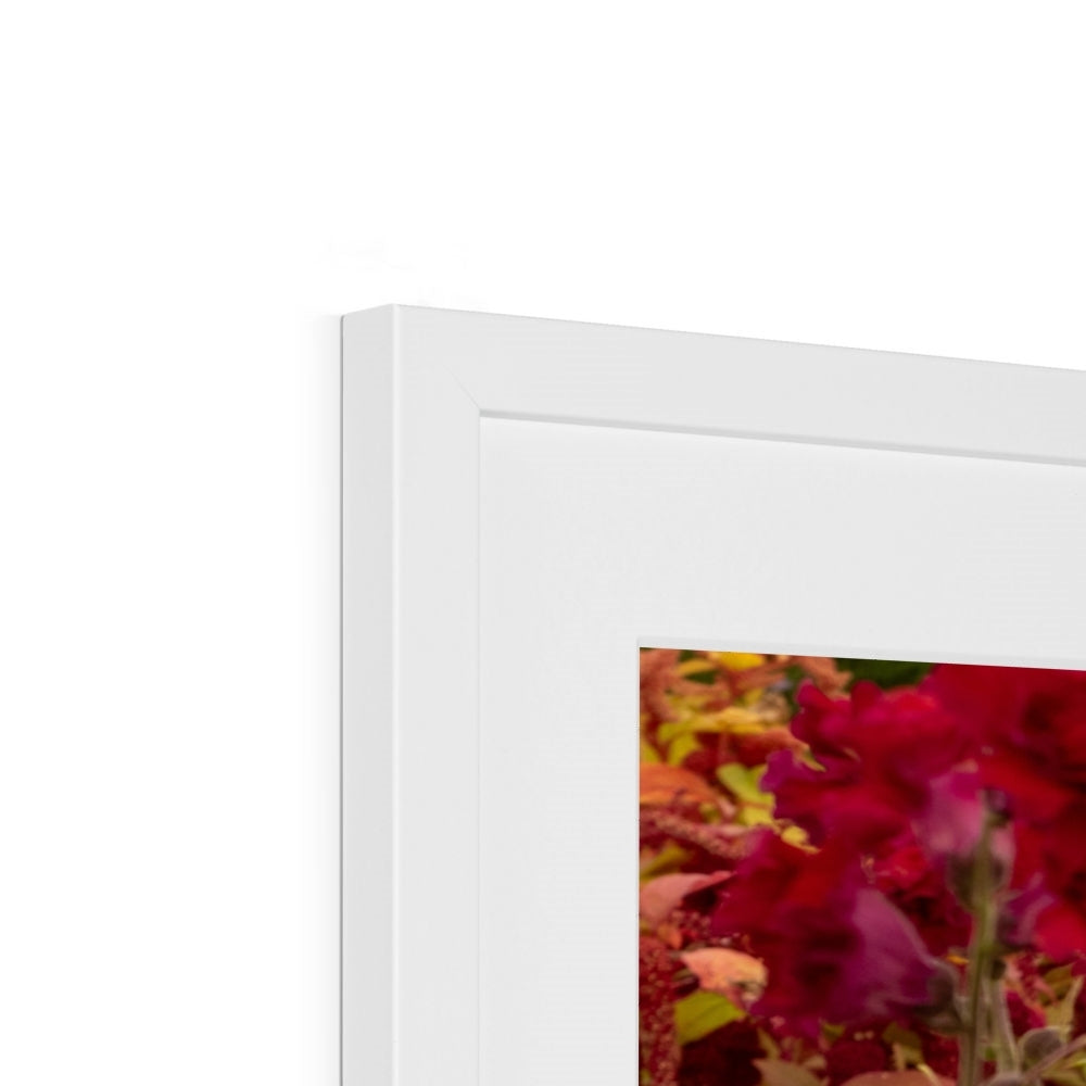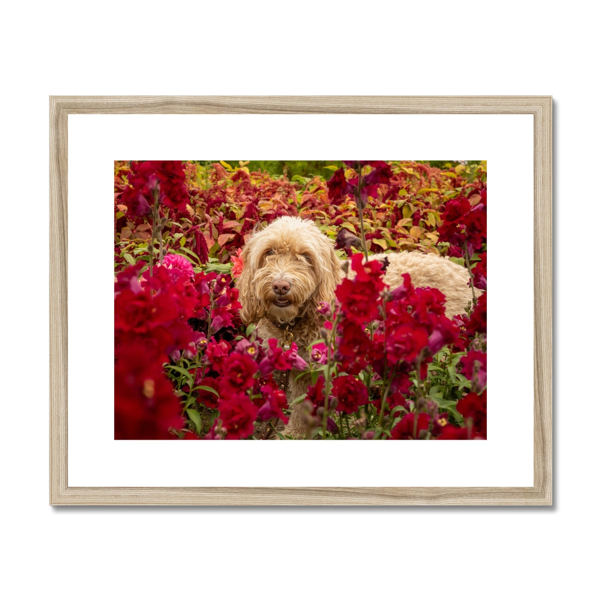 Blonde Cockapoo dog surrounded by vibrant red garden flowers Framed & Mounted Print