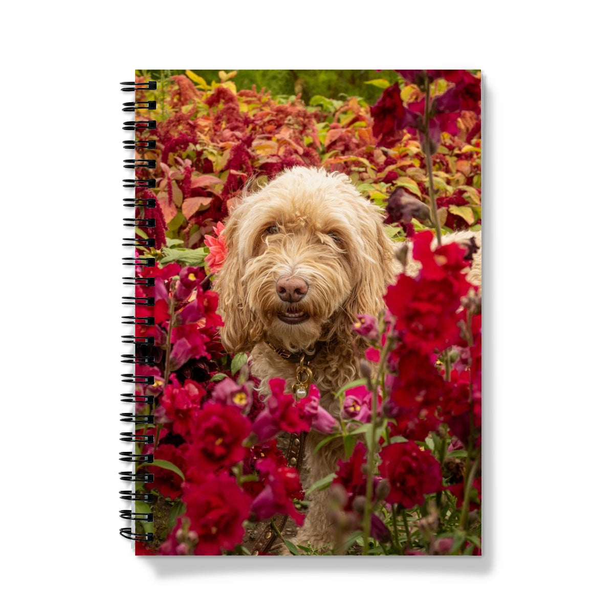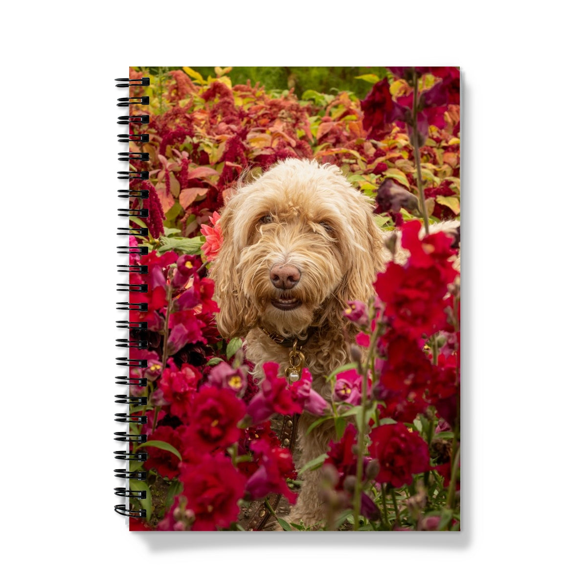 Blonde Cockapoo dog surrounded by vibrant red garden flowers Notebook