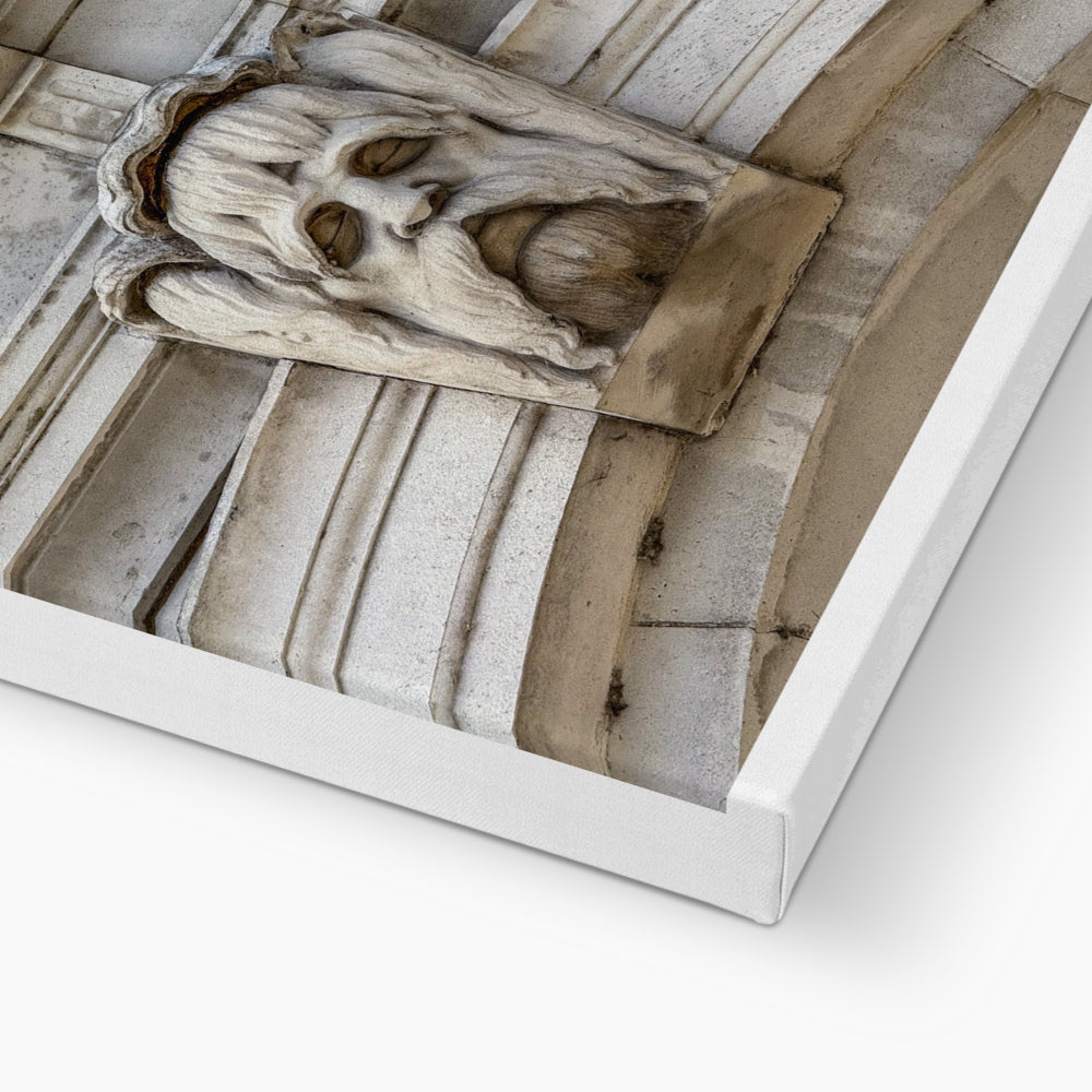 Carved stone face on a keystone of Italian Gardens pump house. London Canvas