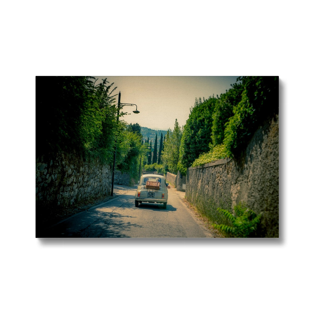 Classic Fiat 500 car driving on a road in Florence, Italy. Canvas