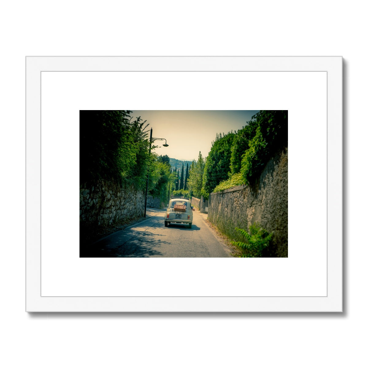 Classic Fiat 500 car driving on a road in Florence, Italy. Framed & Mounted Print