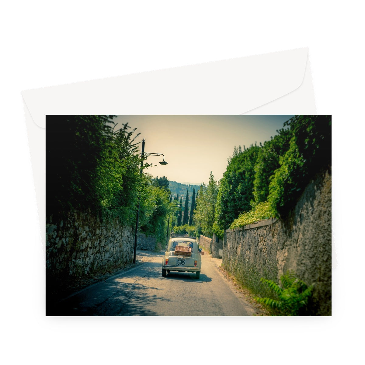 Classic Fiat 500 car driving on a road in Florence, Italy. Greeting Card