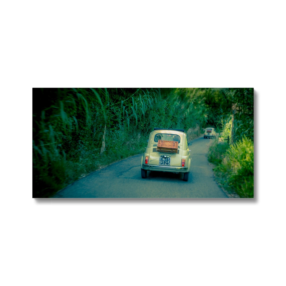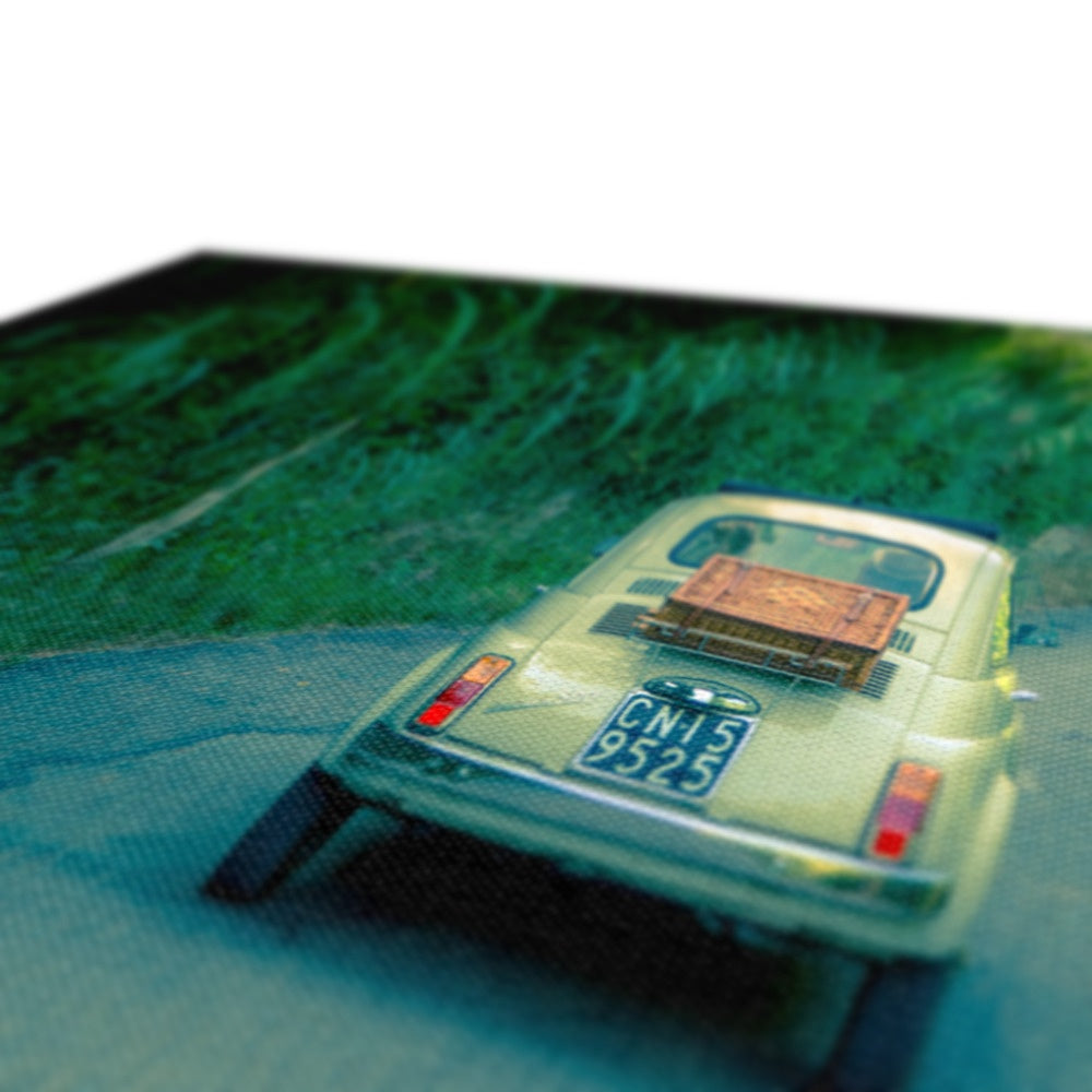 Classic Fiat 500 cars driving on a road in Florence, Italy. Canvas