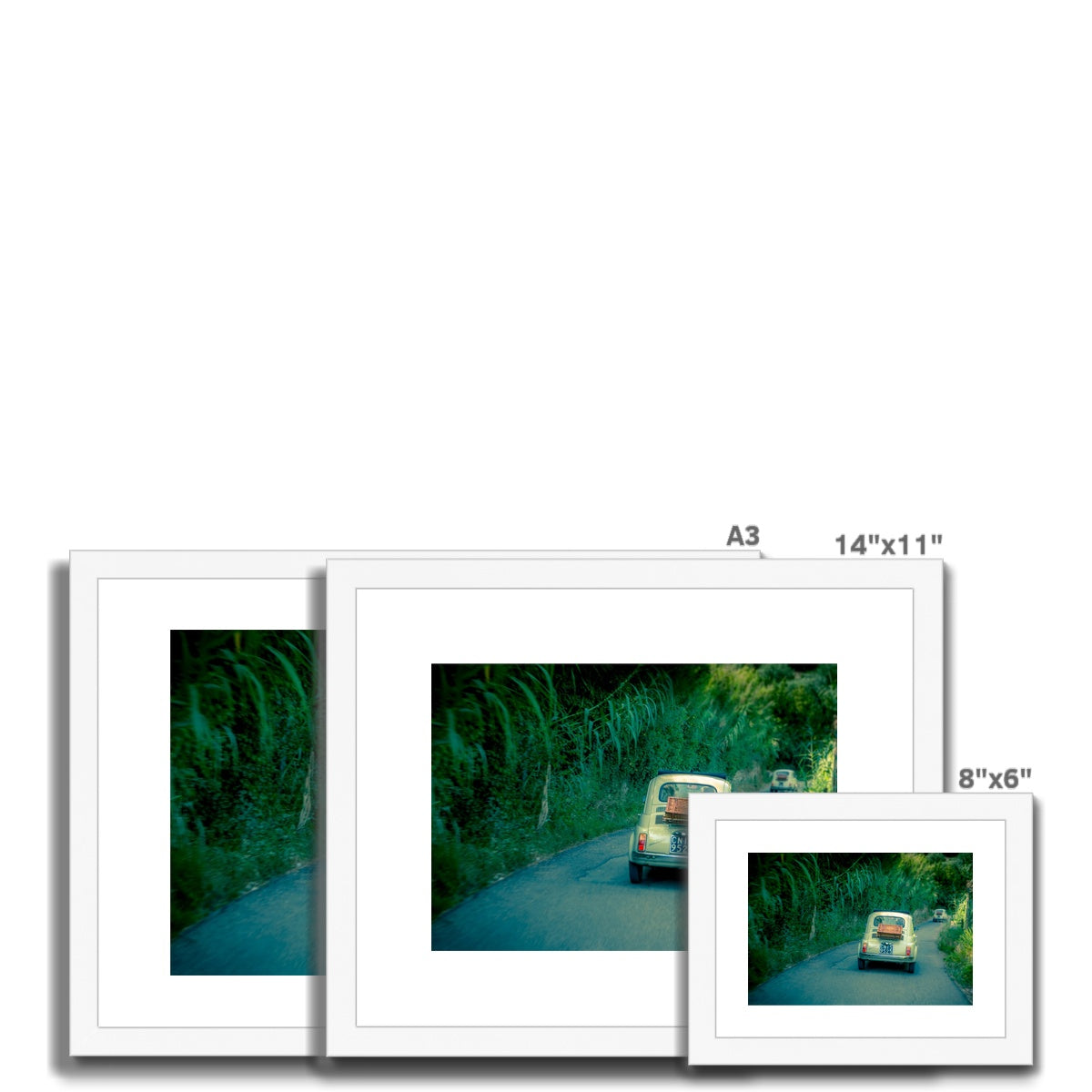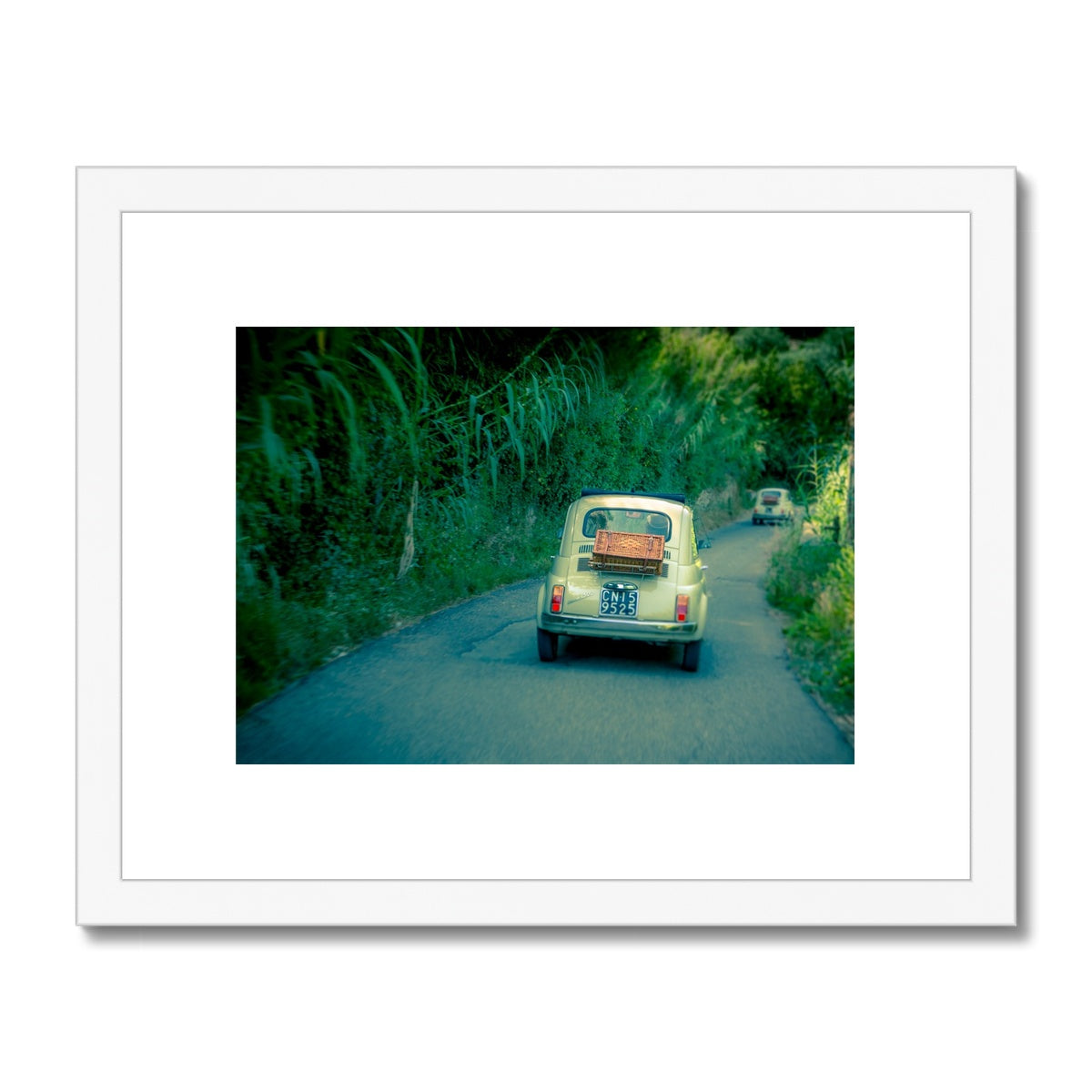 Classic Fiat 500 cars driving on a road in Florence, Italy. Framed & Mounted Print