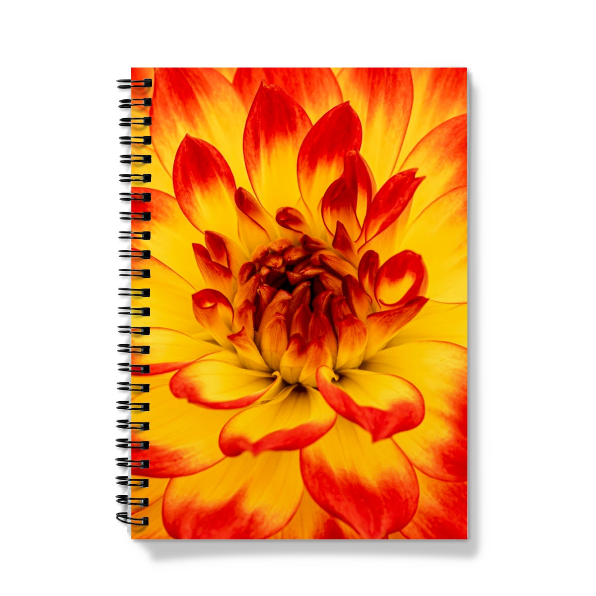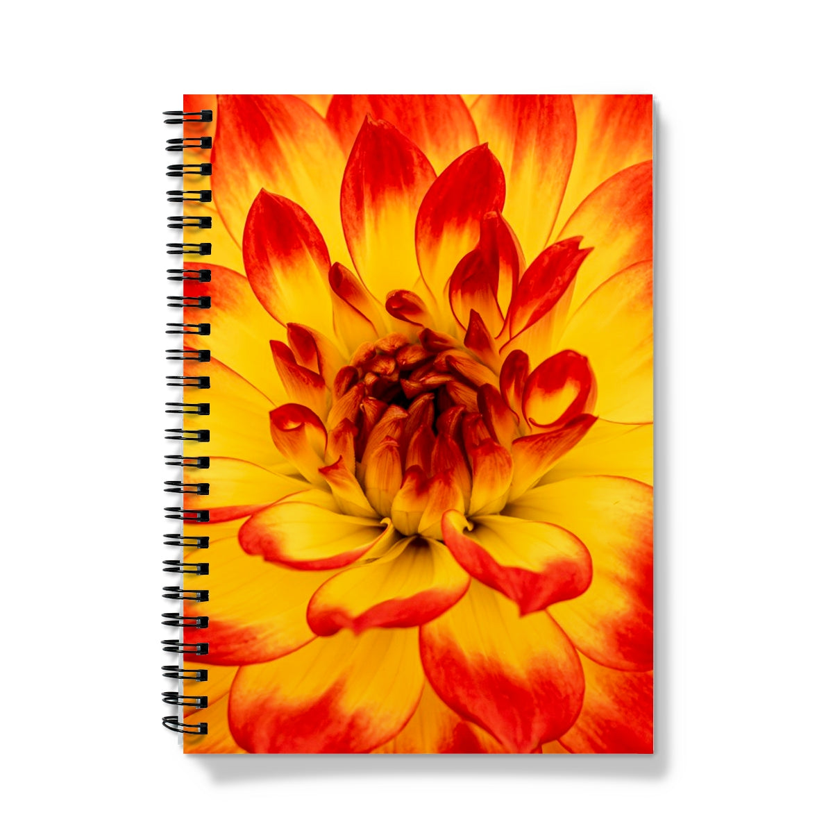 Close-up of fiery Red and Yellow Dahlia Bloom Notebook