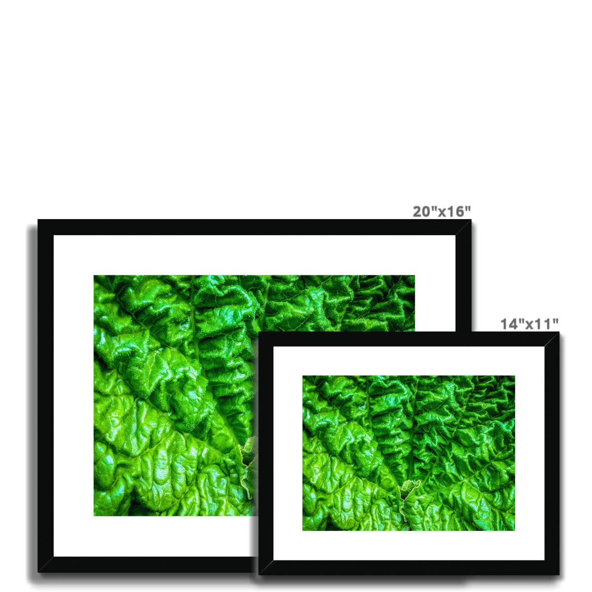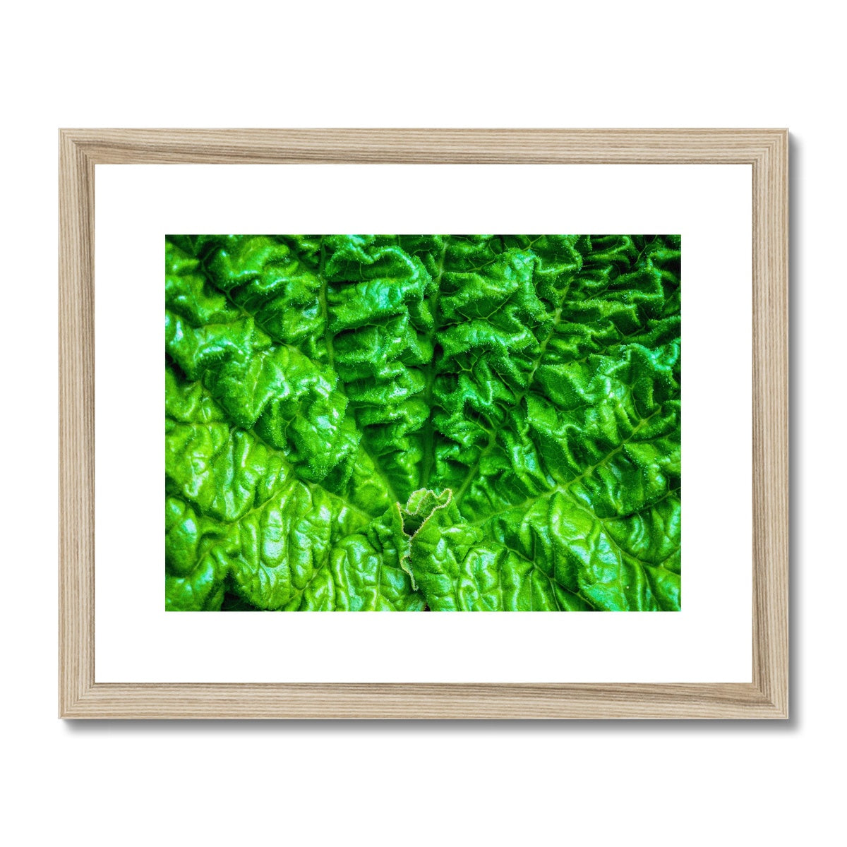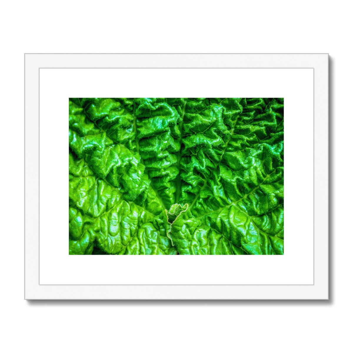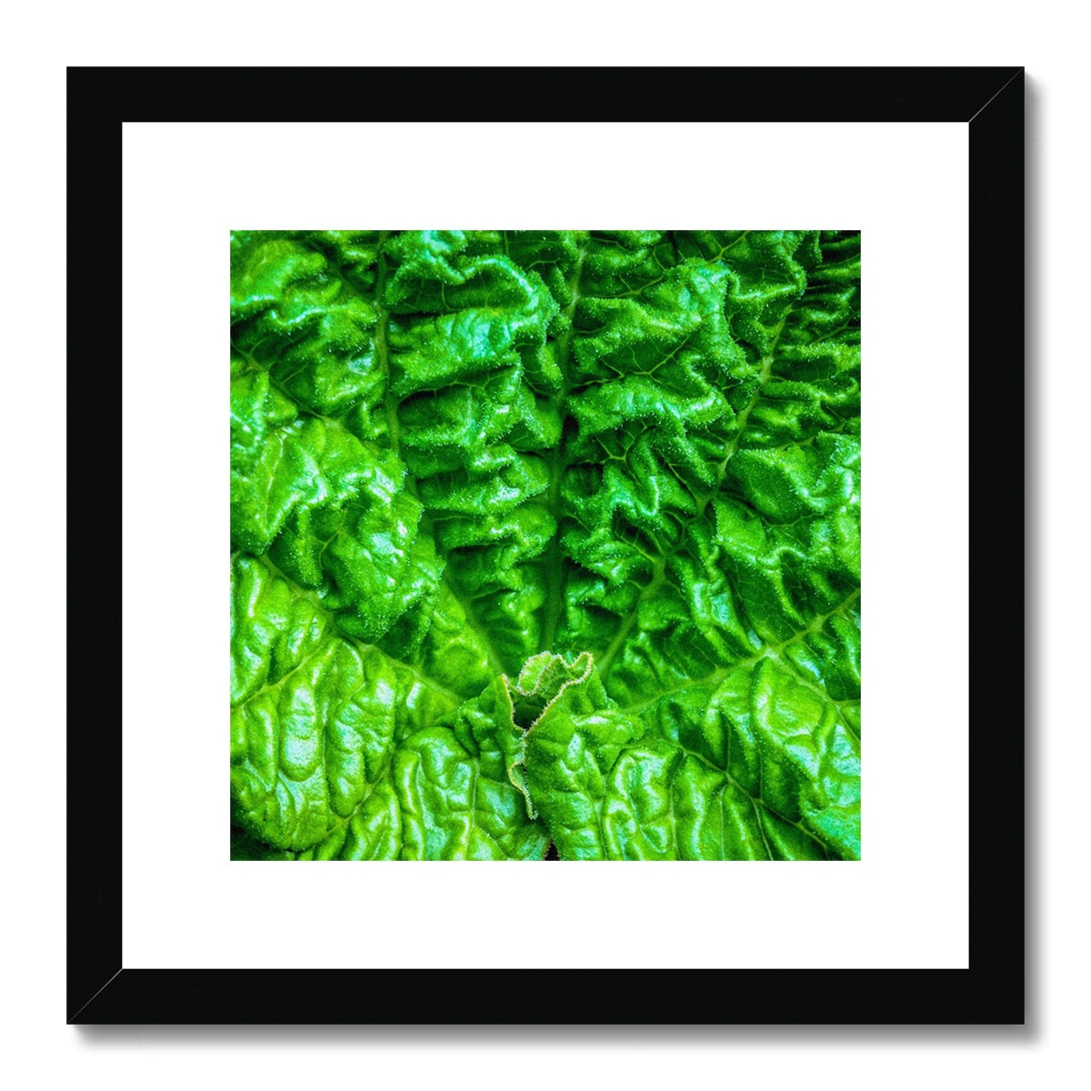 Close-up of the textured surface of a vivid green young rhubarb leaf Framed & Mounted Print