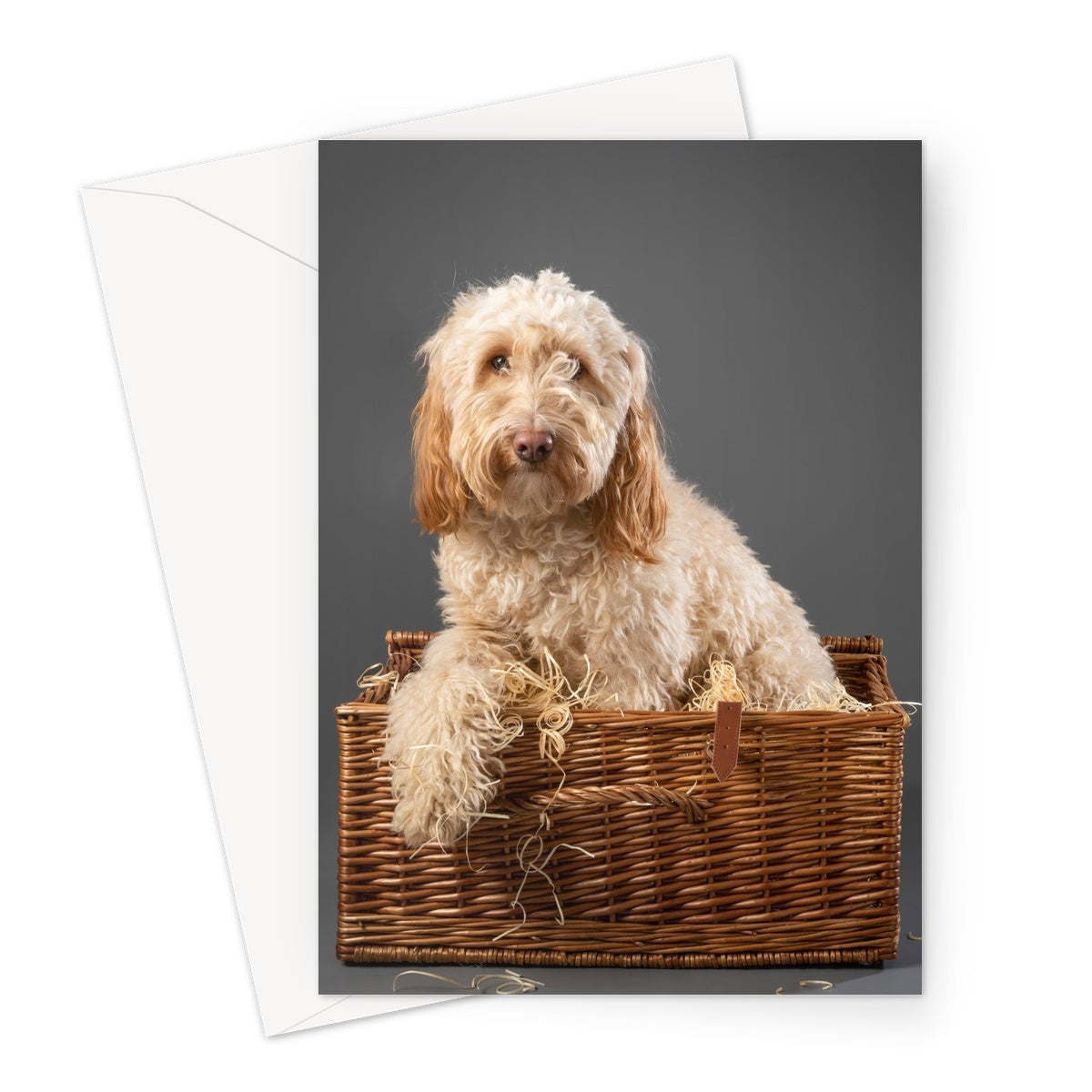 Cockapoo dog inside wicker picnic hamper Greeting Card