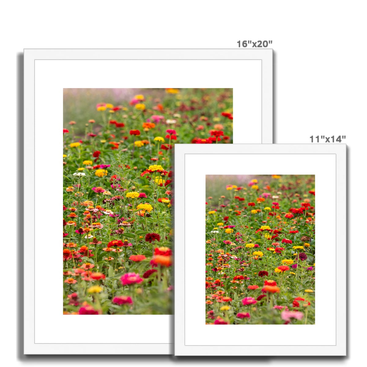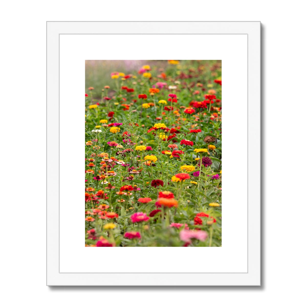 Colourful zinnia flowers blooming in a UK garden. Framed & Mounted Print