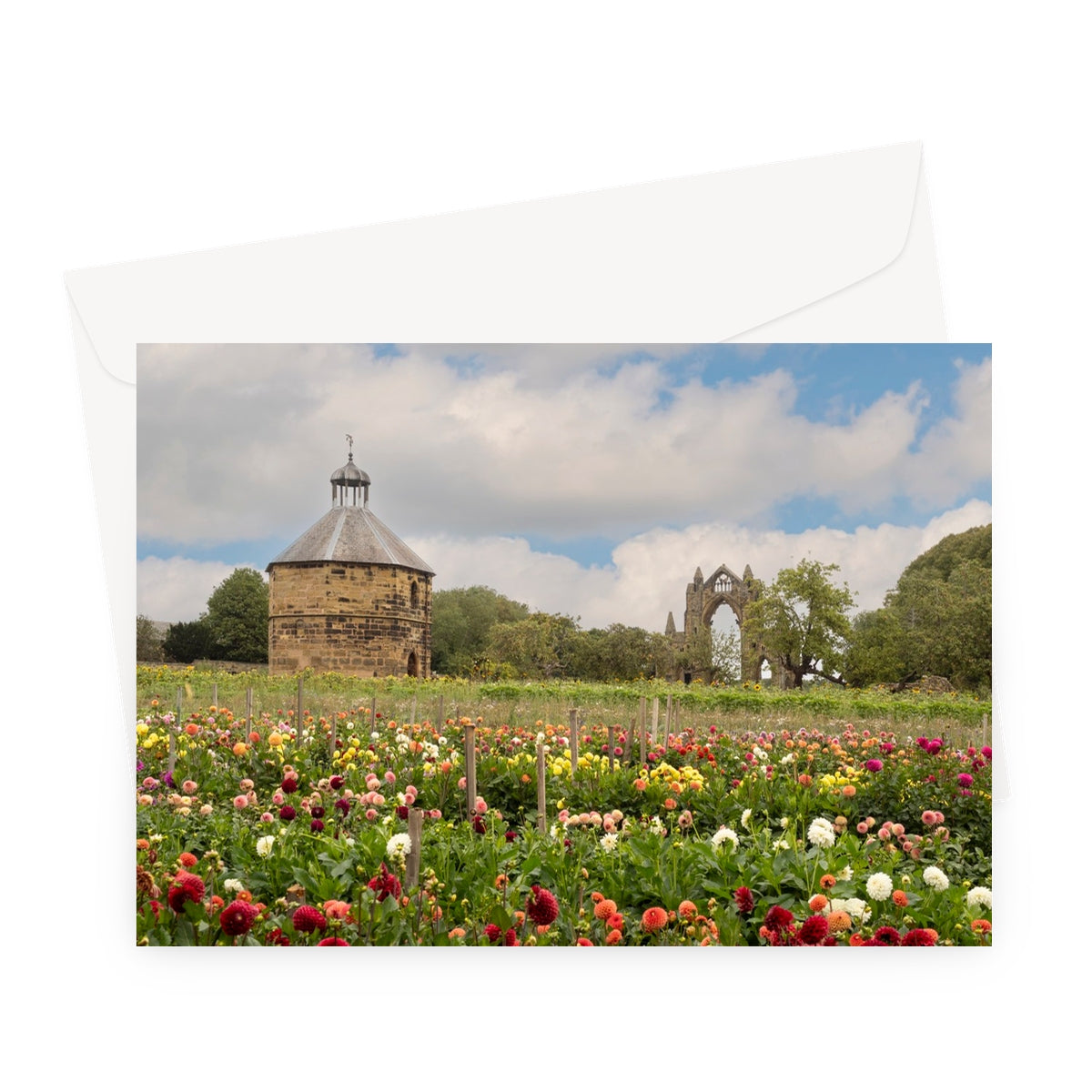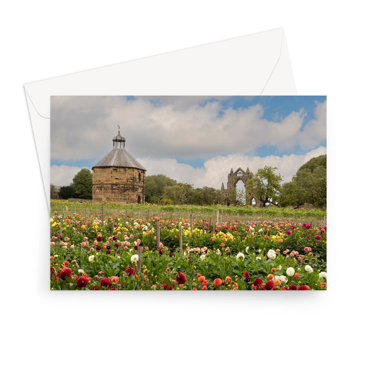 Dovecote and Gisborough Priory beyond dahlia flower field. Guisborough, UK Greeting Card