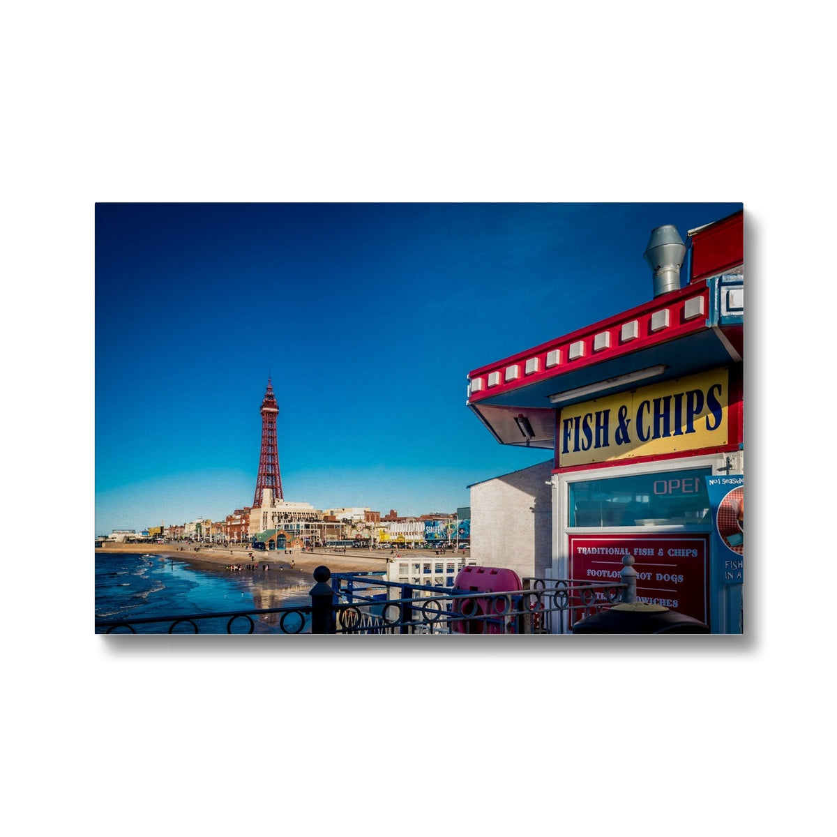 FISH AND CHIPS sign on Central Pier and Blackpool Tower. Canvas