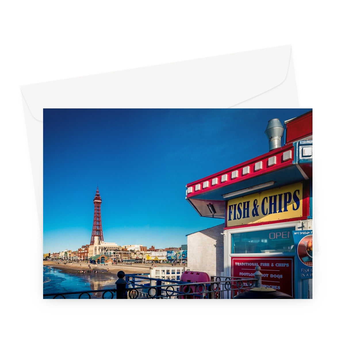 FISH AND CHIPS sign on Central Pier and Blackpool Tower. Greeting Card