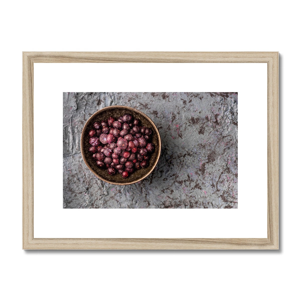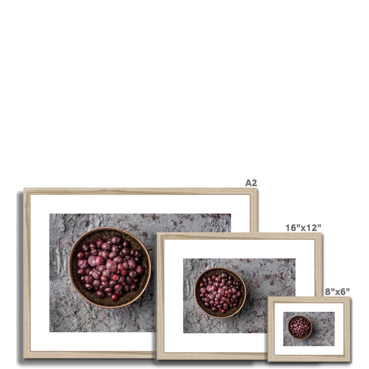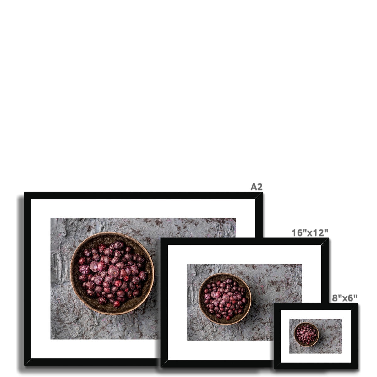 Flat lay: bowl of frozen blueberries Framed & Mounted Print