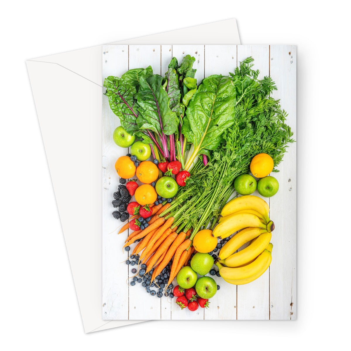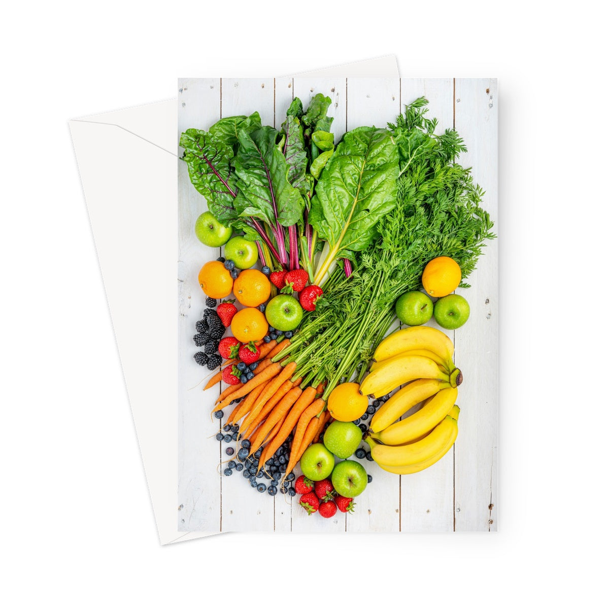 Flat lay of fresh fruit and vegetables on a modern rustic background Greeting Card