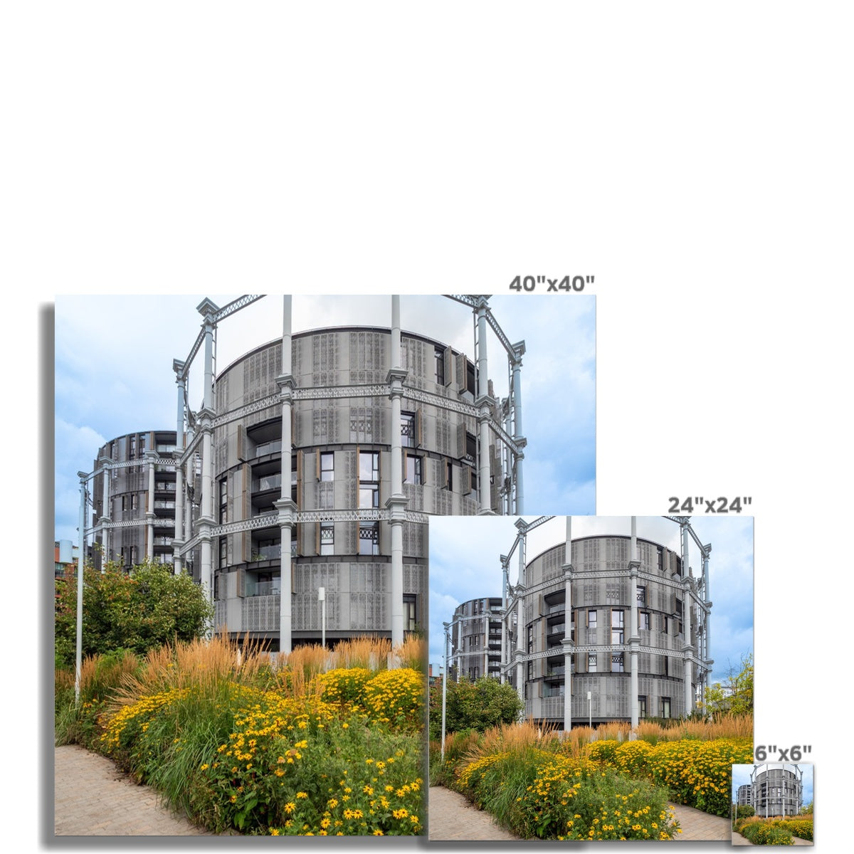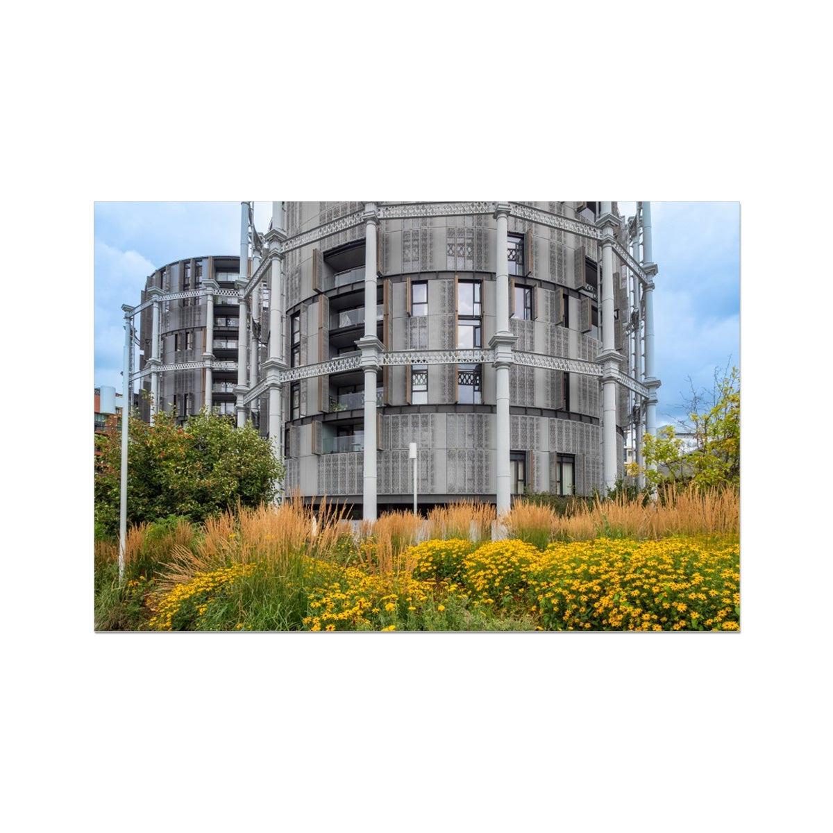 Gasholder Park apartments. Urban architecture with wildflower planting Fine Art Print