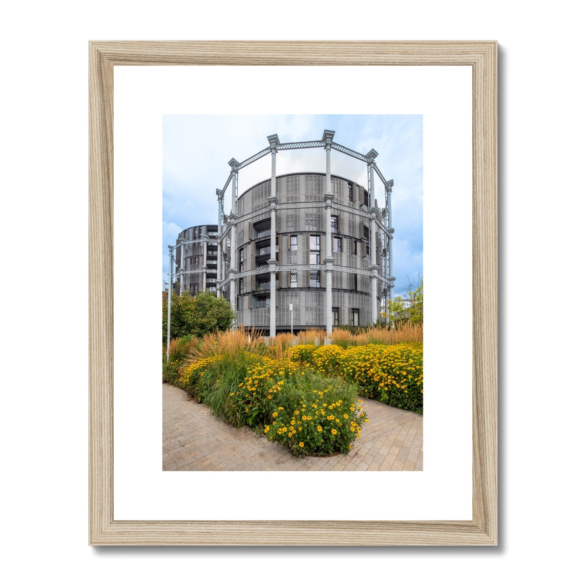 Gasholder Park apartments. Urban architecture with wildflower planting Framed & Mounted Print