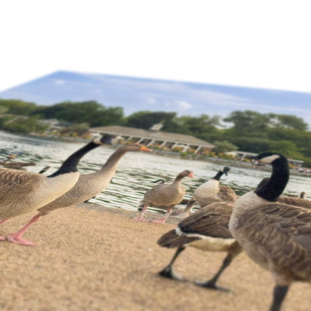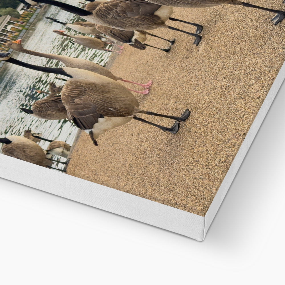 Geese on the bank of the Serpentine lake with the Lido Café in the distance. London Canvas