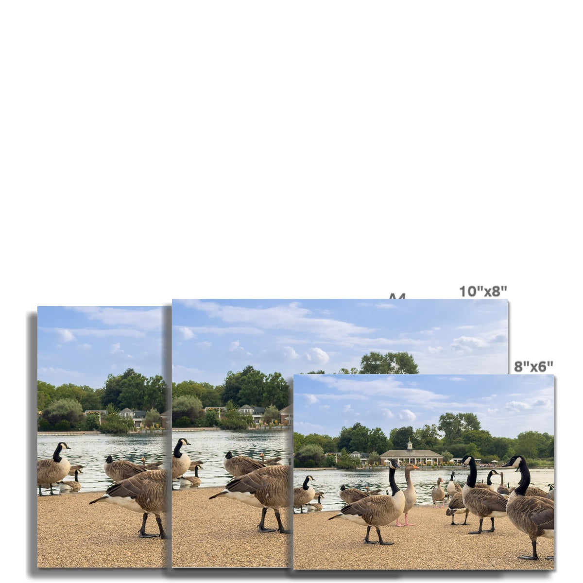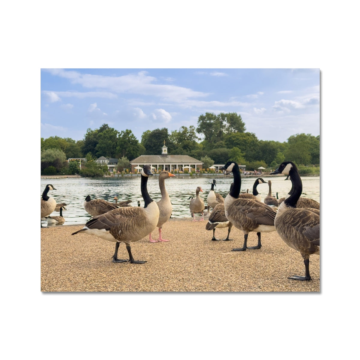 Geese on the bank of the Serpentine lake with the Lido Café in the distance. London Fine Art Print