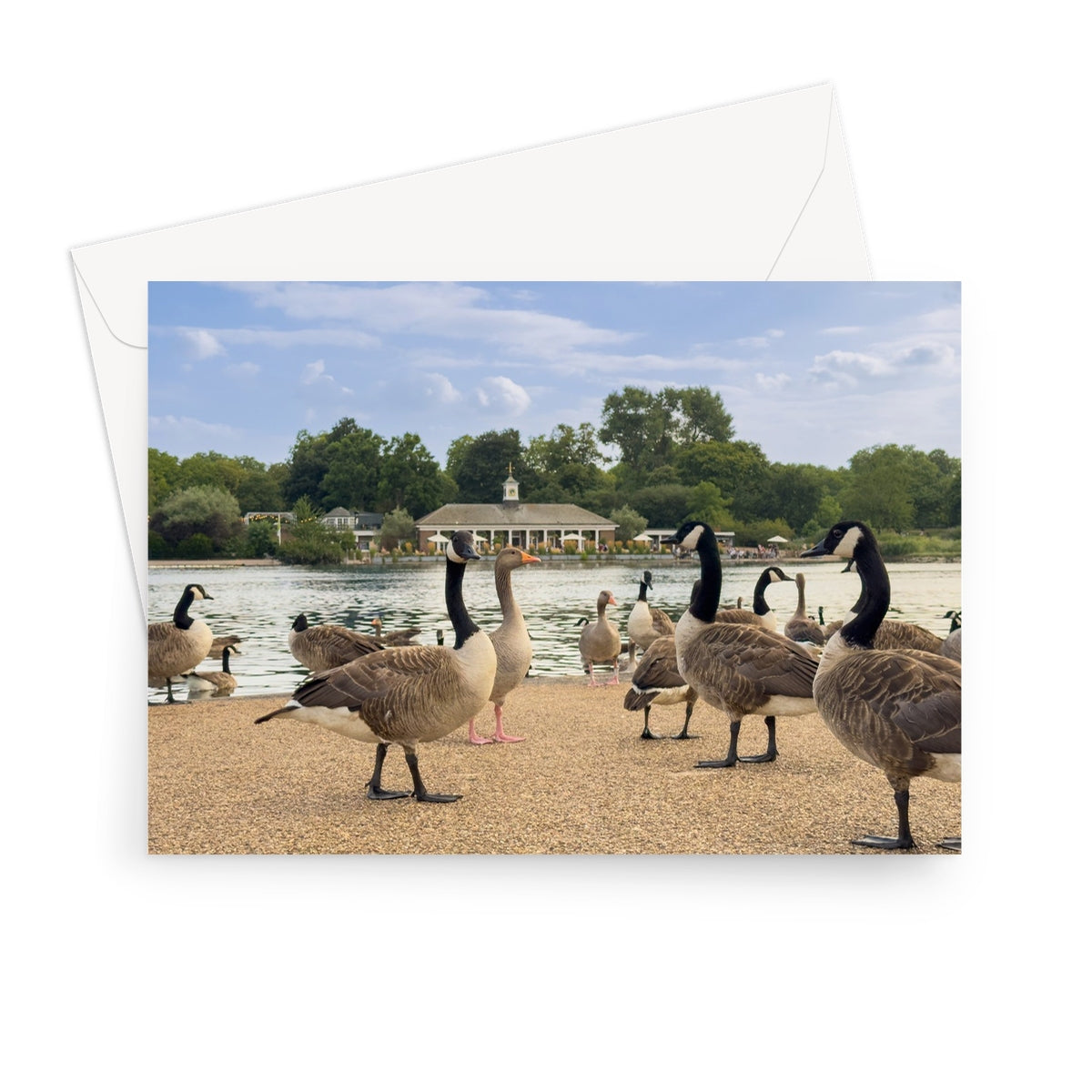 Geese on the bank of the Serpentine lake with the Lido Café in the distance. London Greeting Card