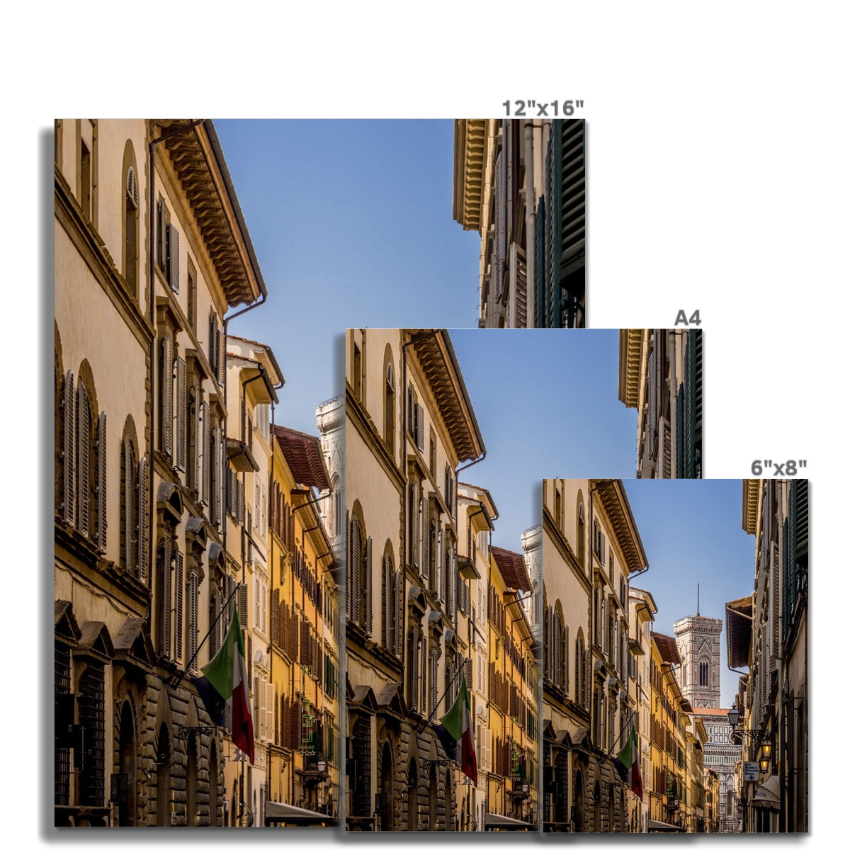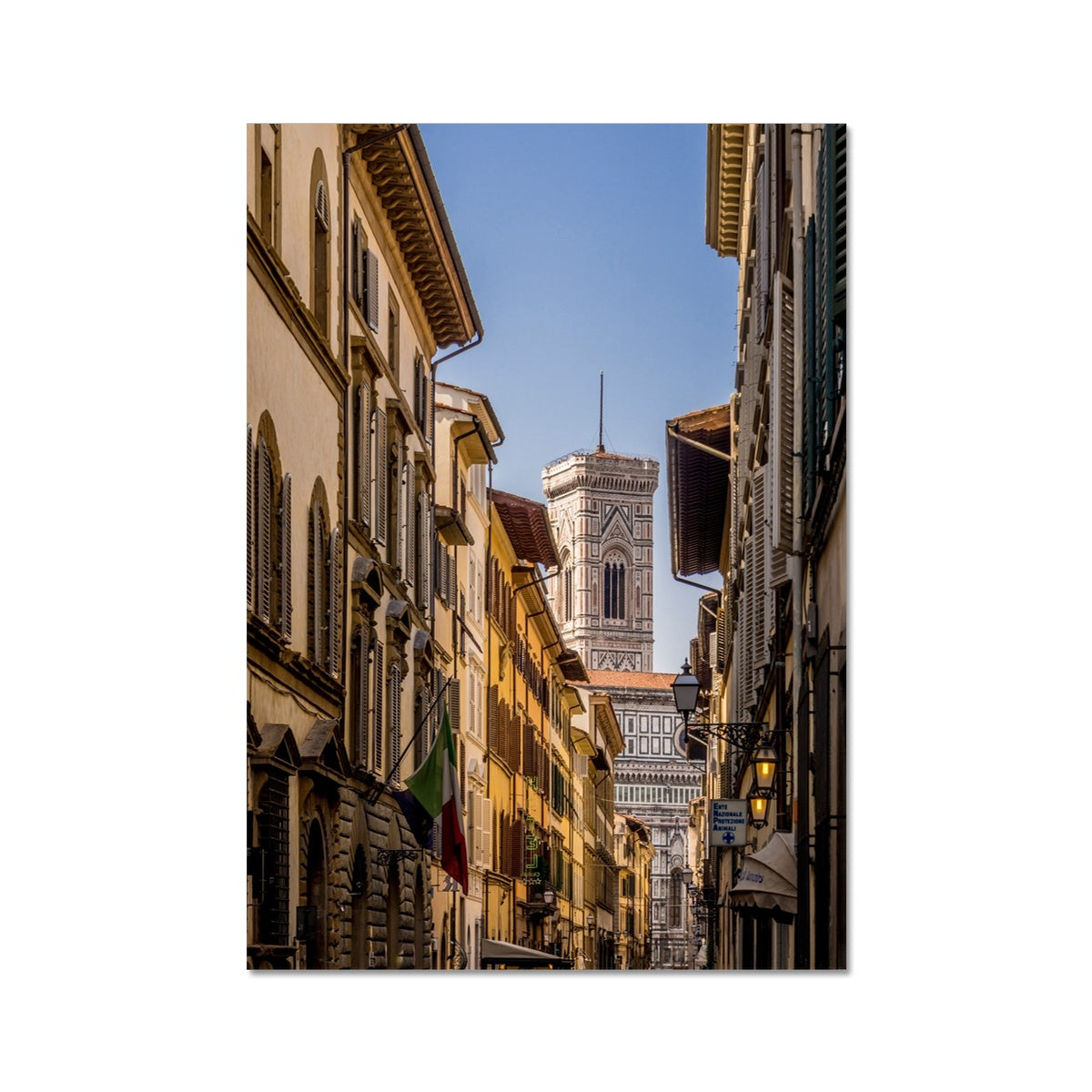 Giotto's Campanile glimpsed between buildings in the city of Florence, Italy. Fine Art Print