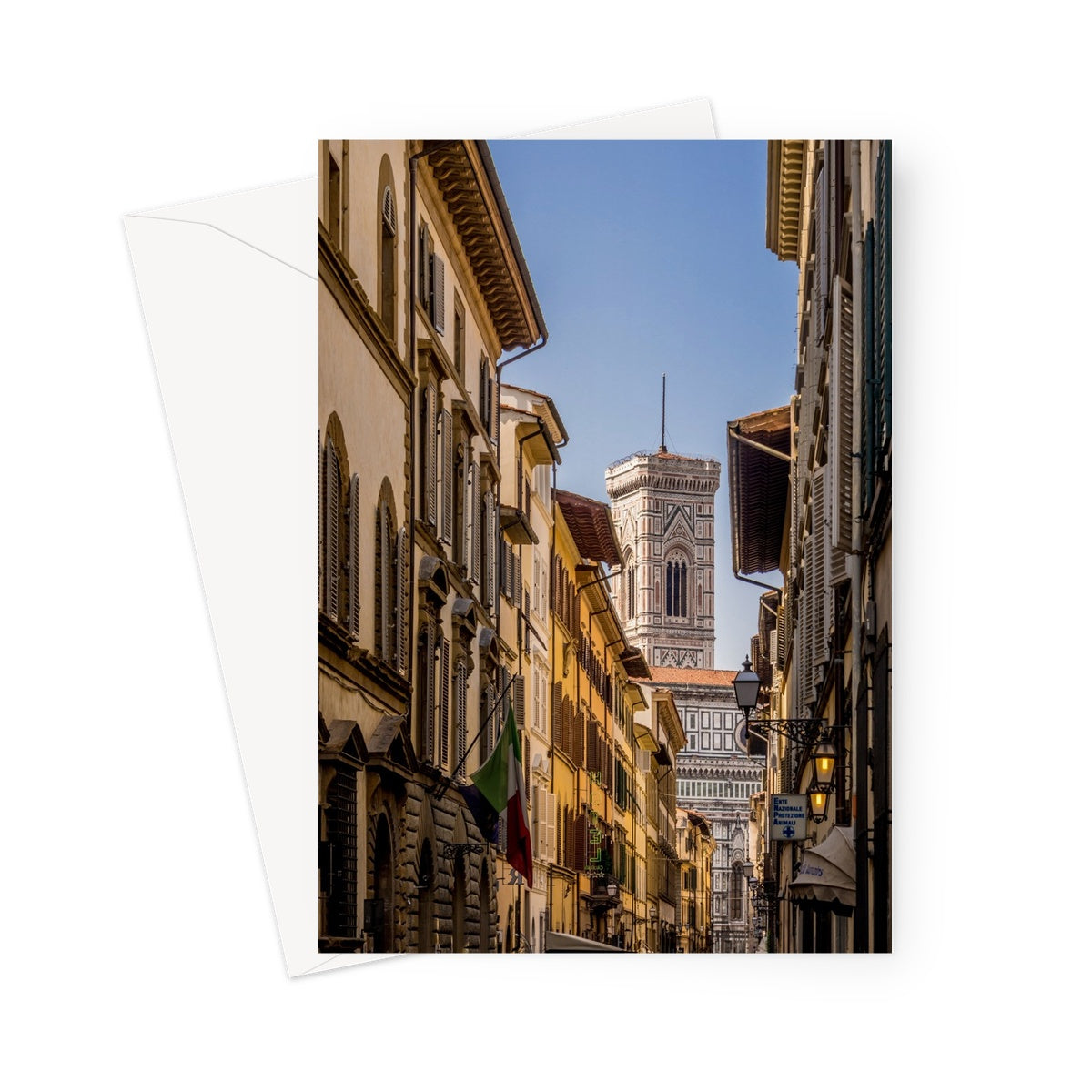 Giotto's Campanile glimpsed between buildings in the city of Florence, Italy. Greeting Card