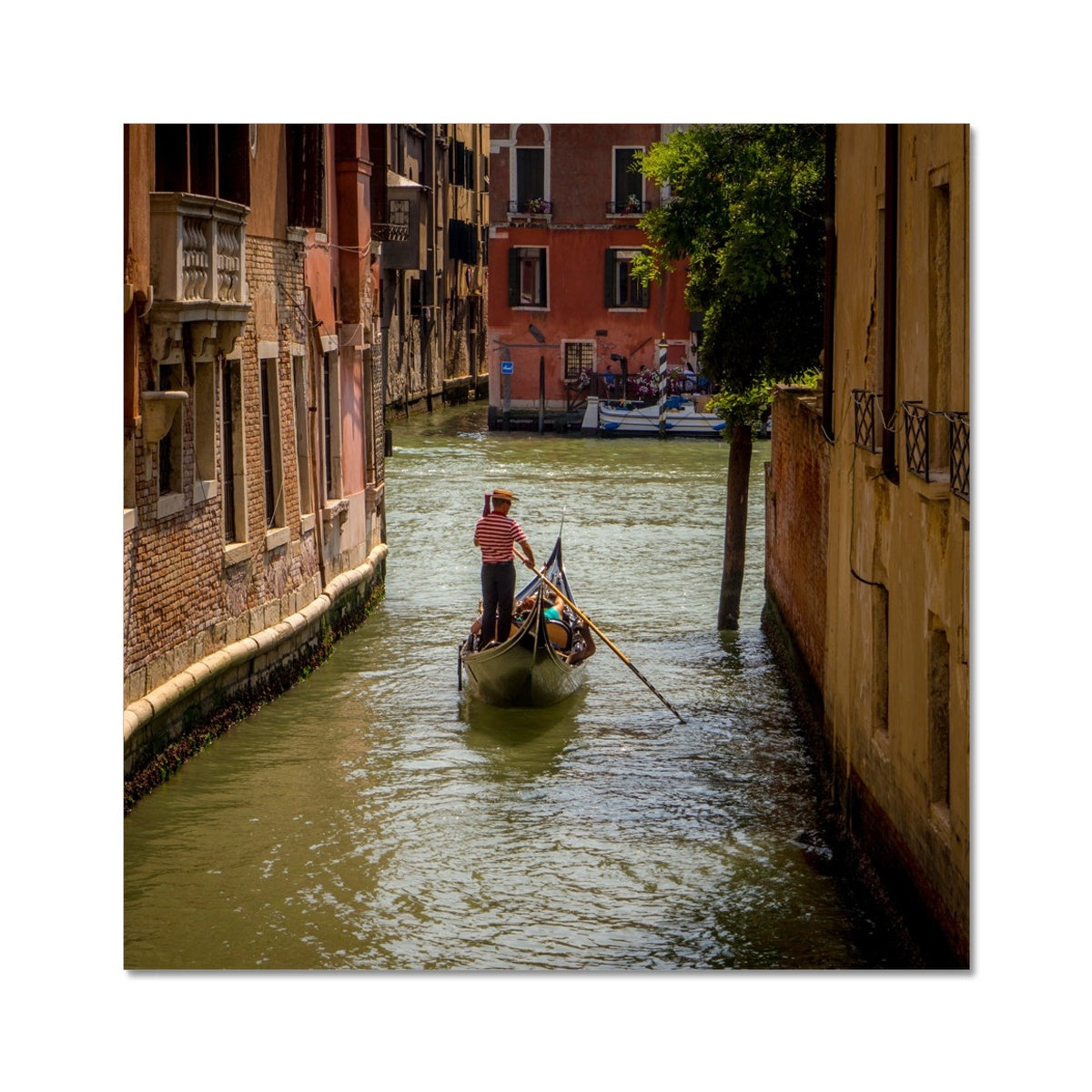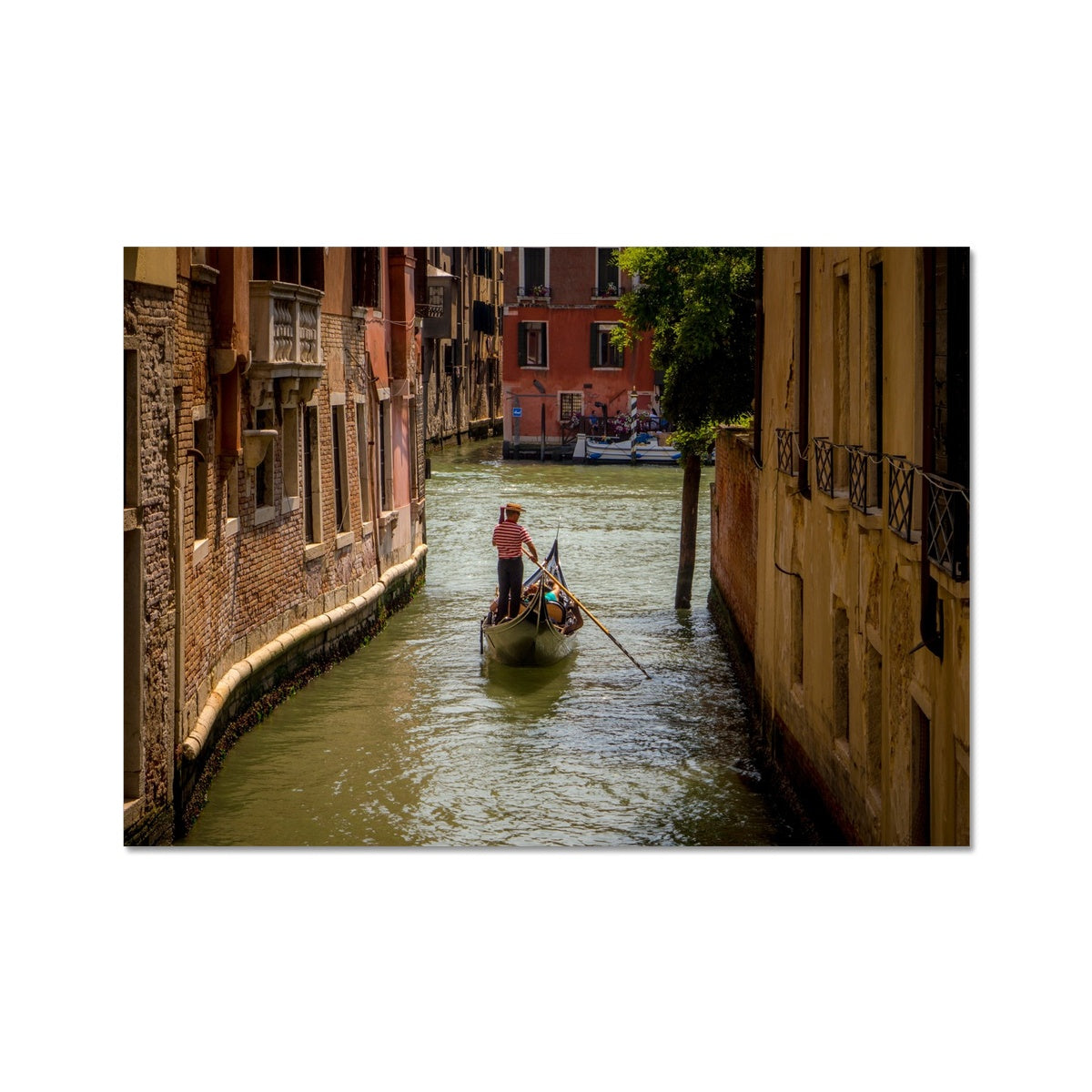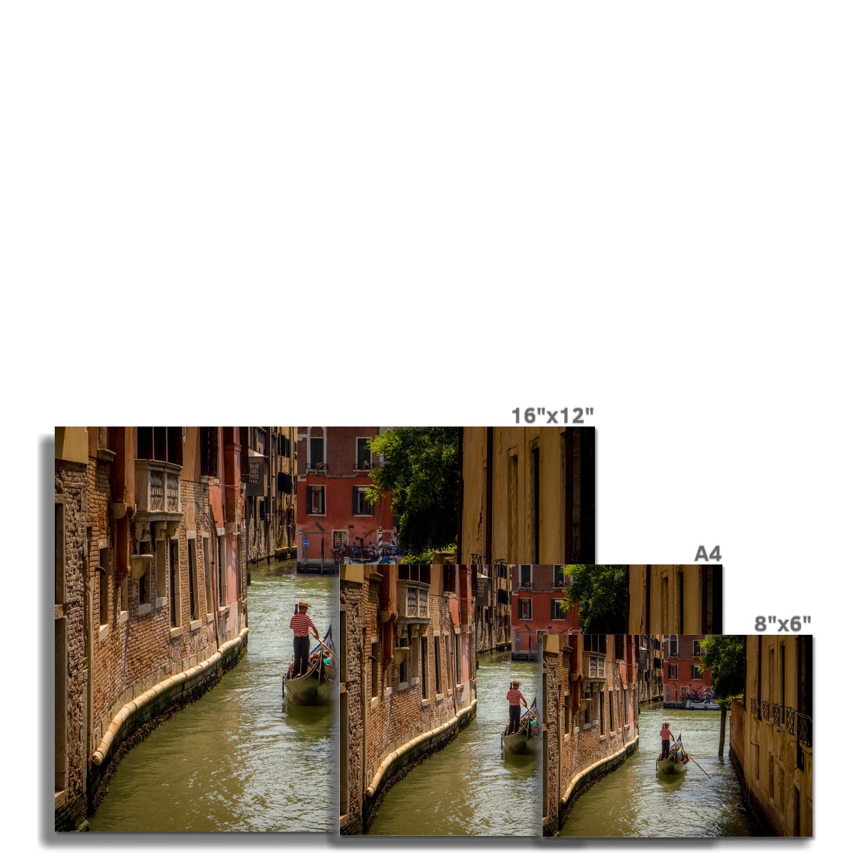 Gondola with gondolier wearing a traditional boater hat and striped top on a canal in Venice. Italy. Fine Art Print