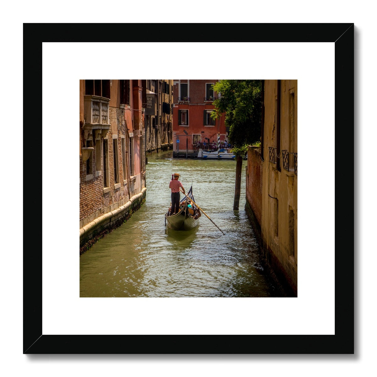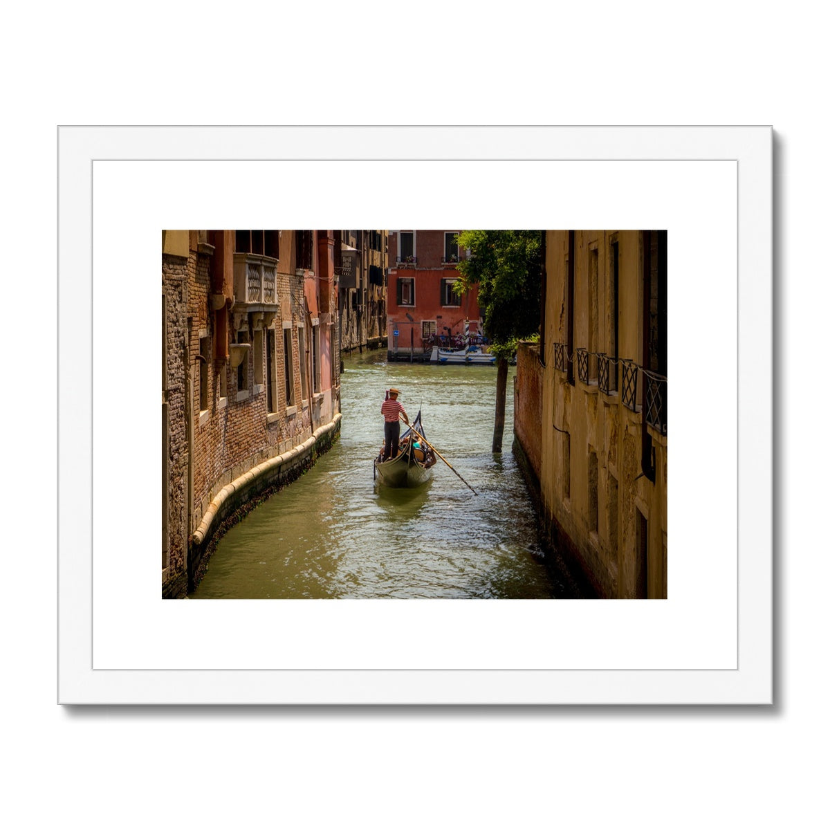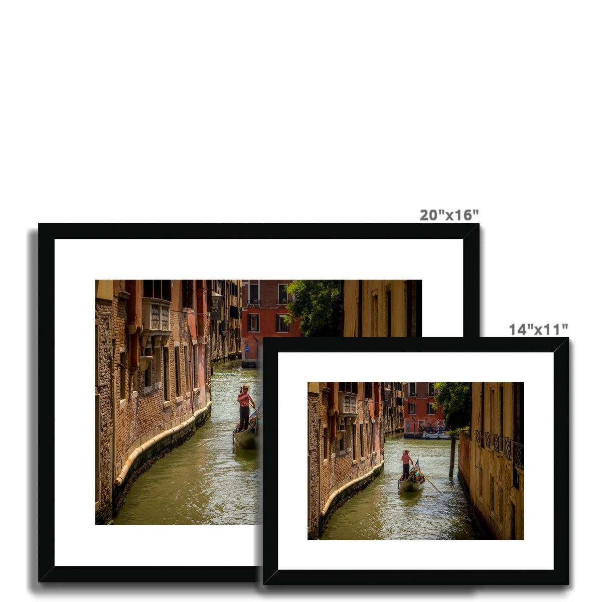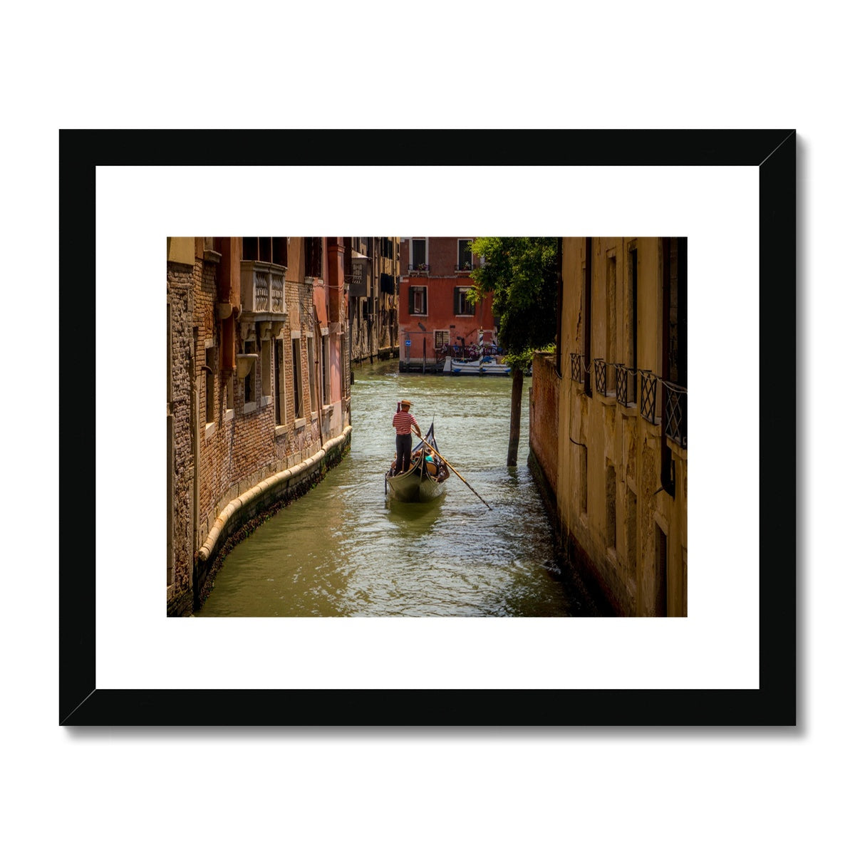 Gondola with gondolier wearing a traditional boater hat and striped top on a canal in Venice. Italy. Framed & Mounted Print