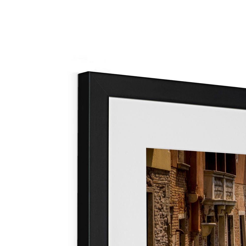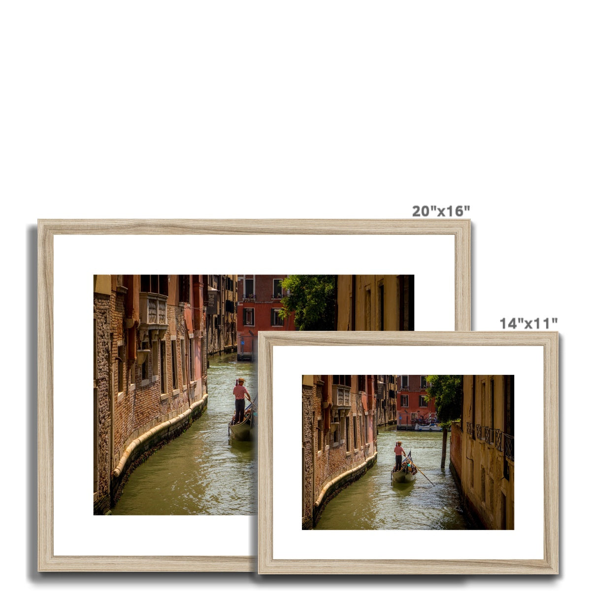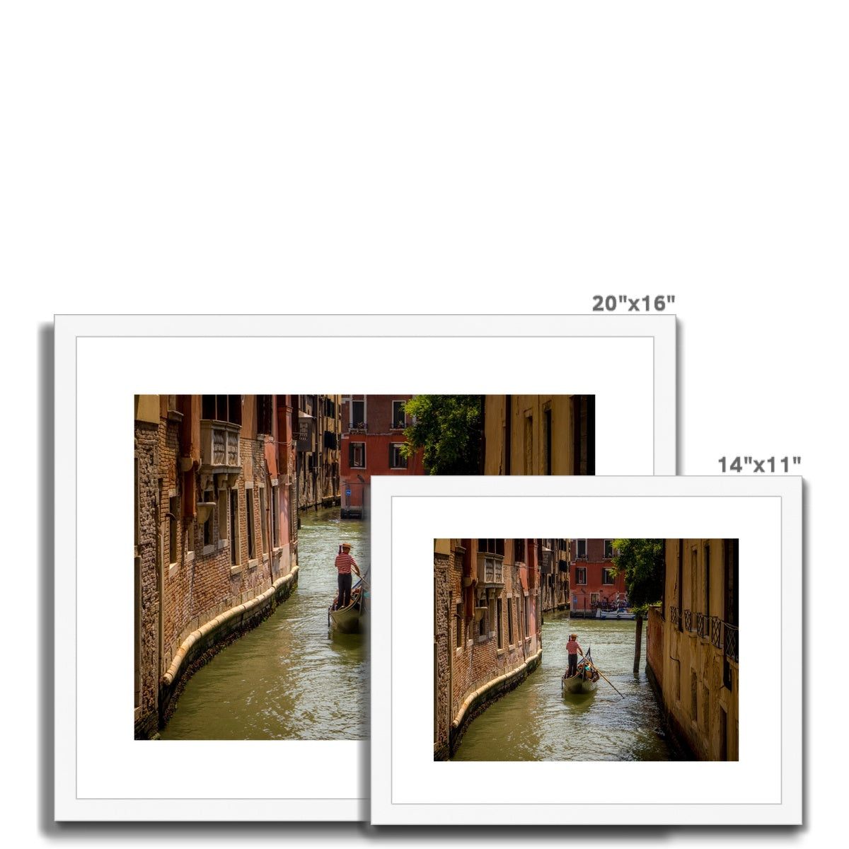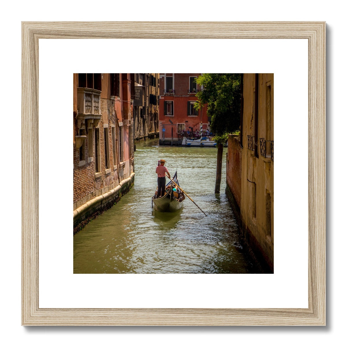 Gondola with gondolier wearing a traditional boater hat and striped top on a canal in Venice. Italy. Framed & Mounted Print