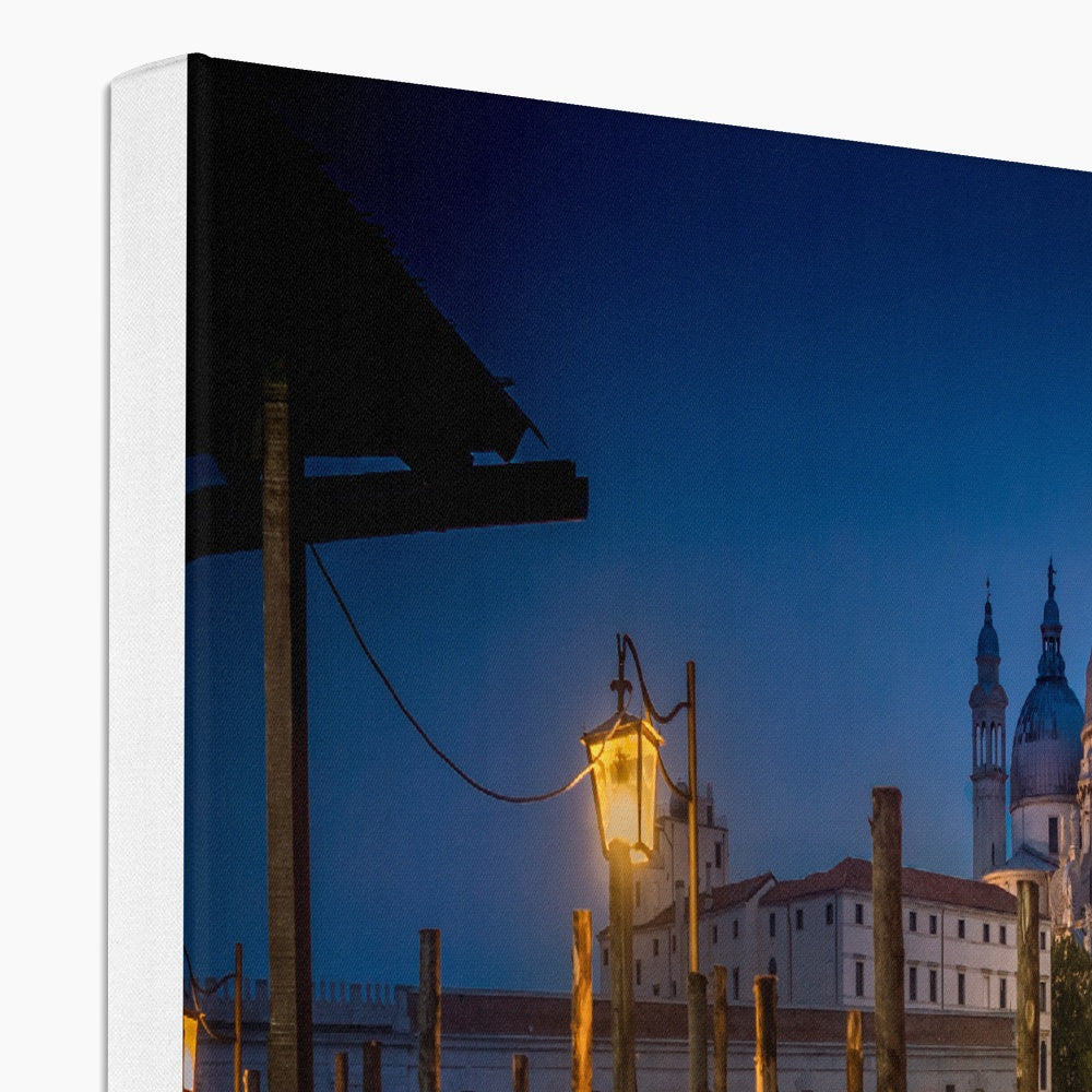Gondolas moored for the night on the Grand Canal with the church of Santa Maria della Salute in the background. Venice, Italy. - Canvas