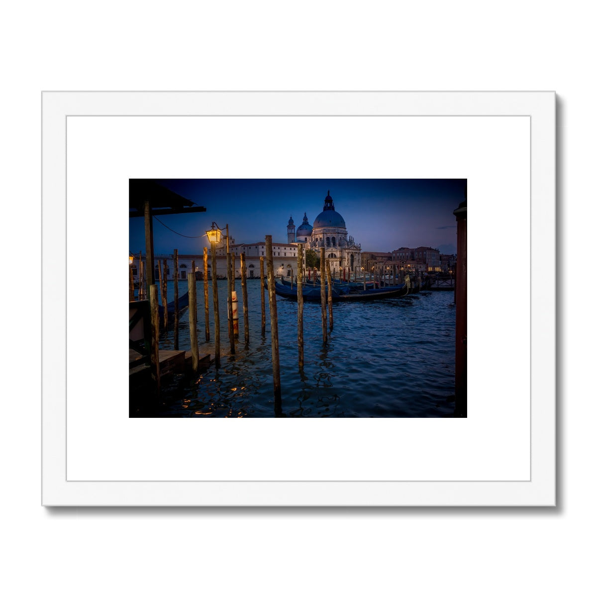 Gondolas moored for the night on the Grand Canal with the church of Santa Maria della Salute in the background. Venice, Italy. - Framed & Mounted Print
