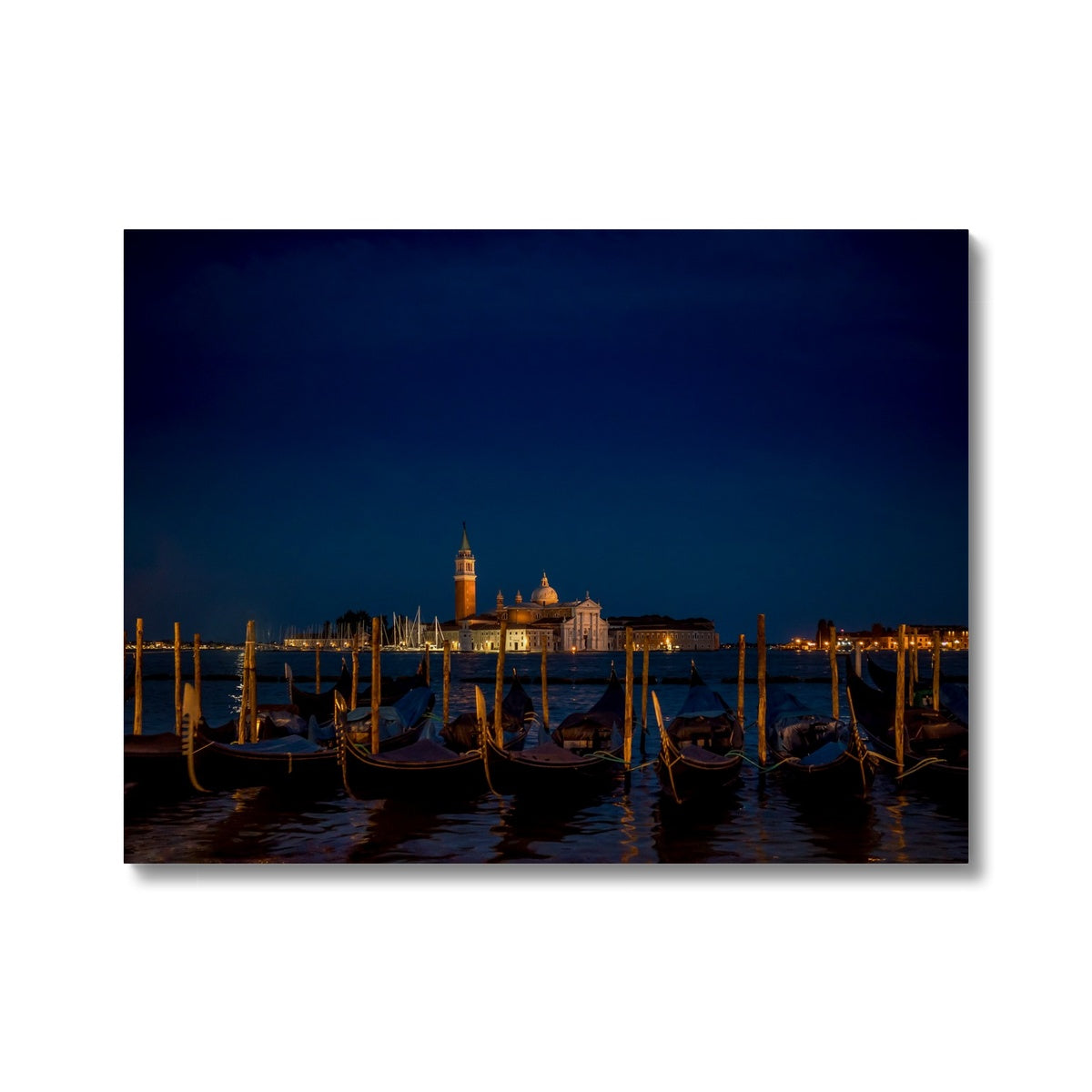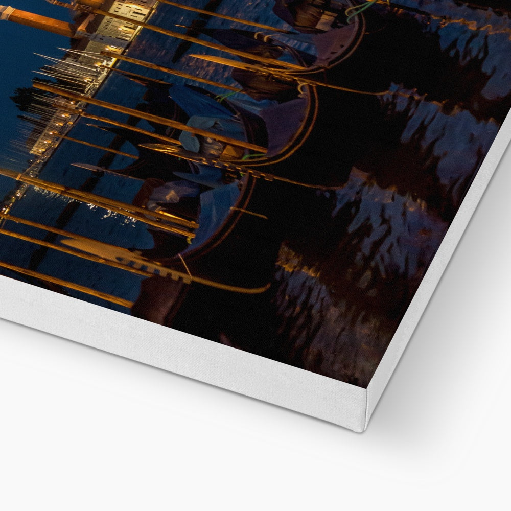 Gondolas moored in St Mark's Basin with San Giorgio Maggiore in the background at night, Venice, Italy. Canvas